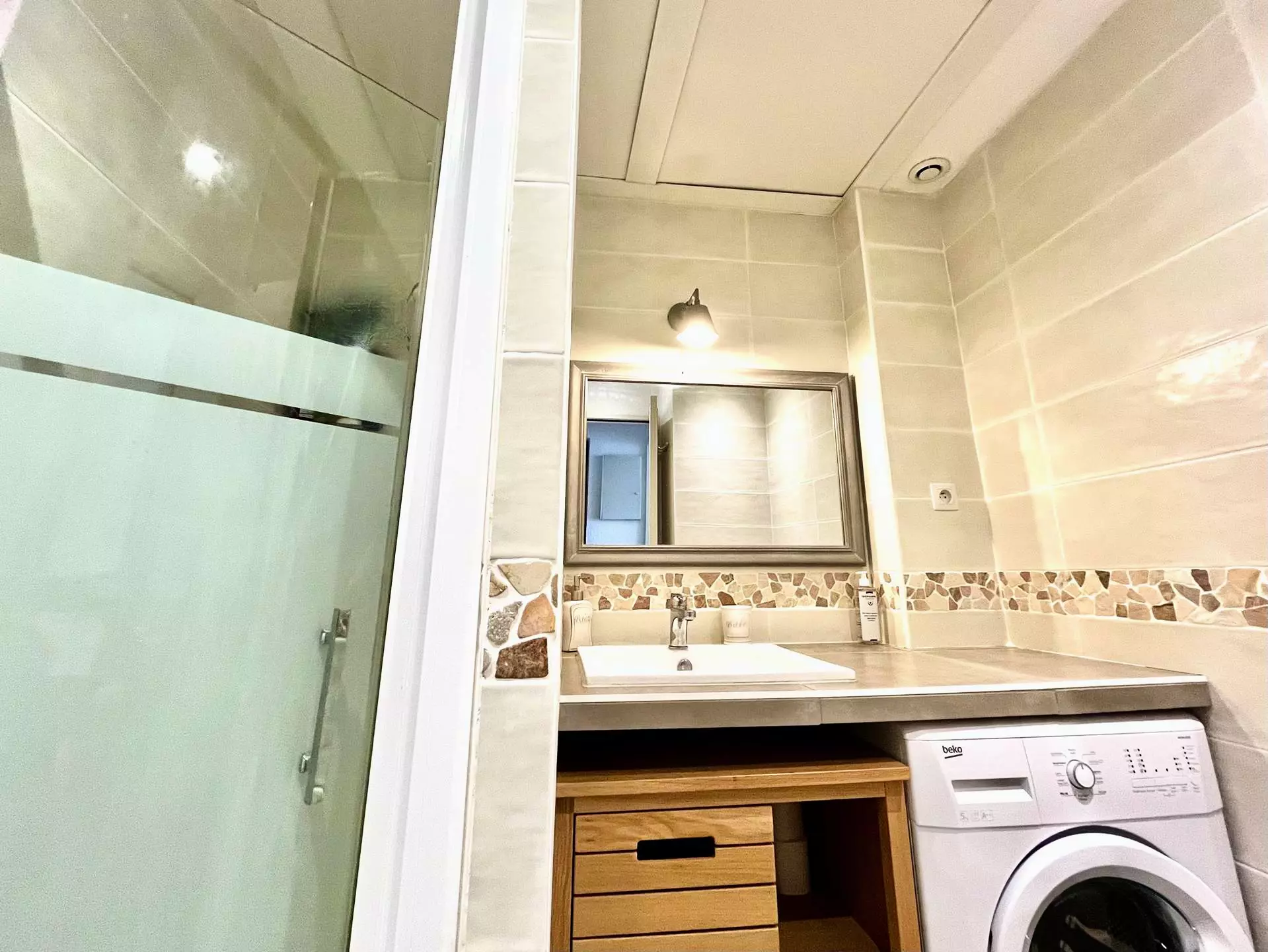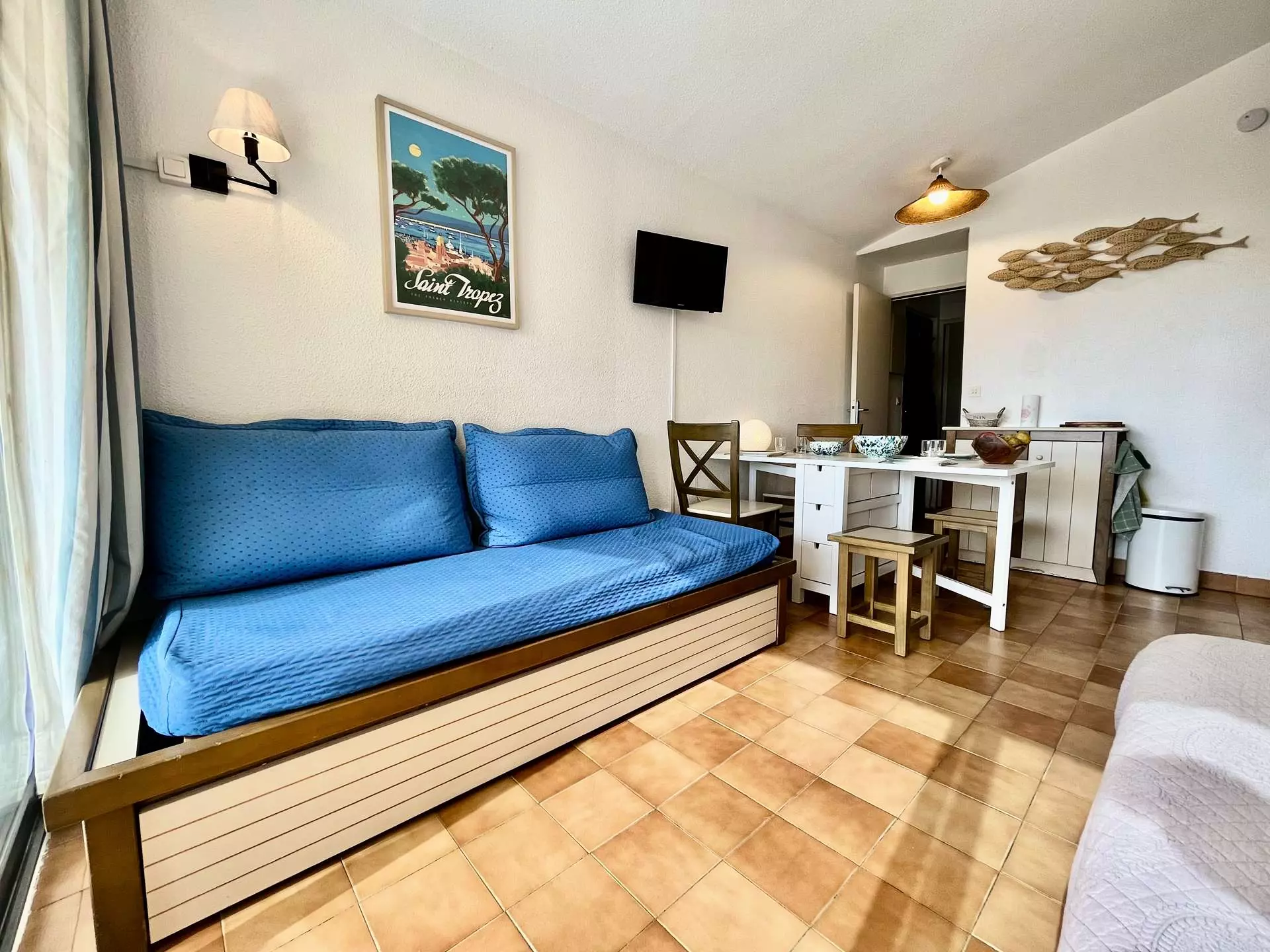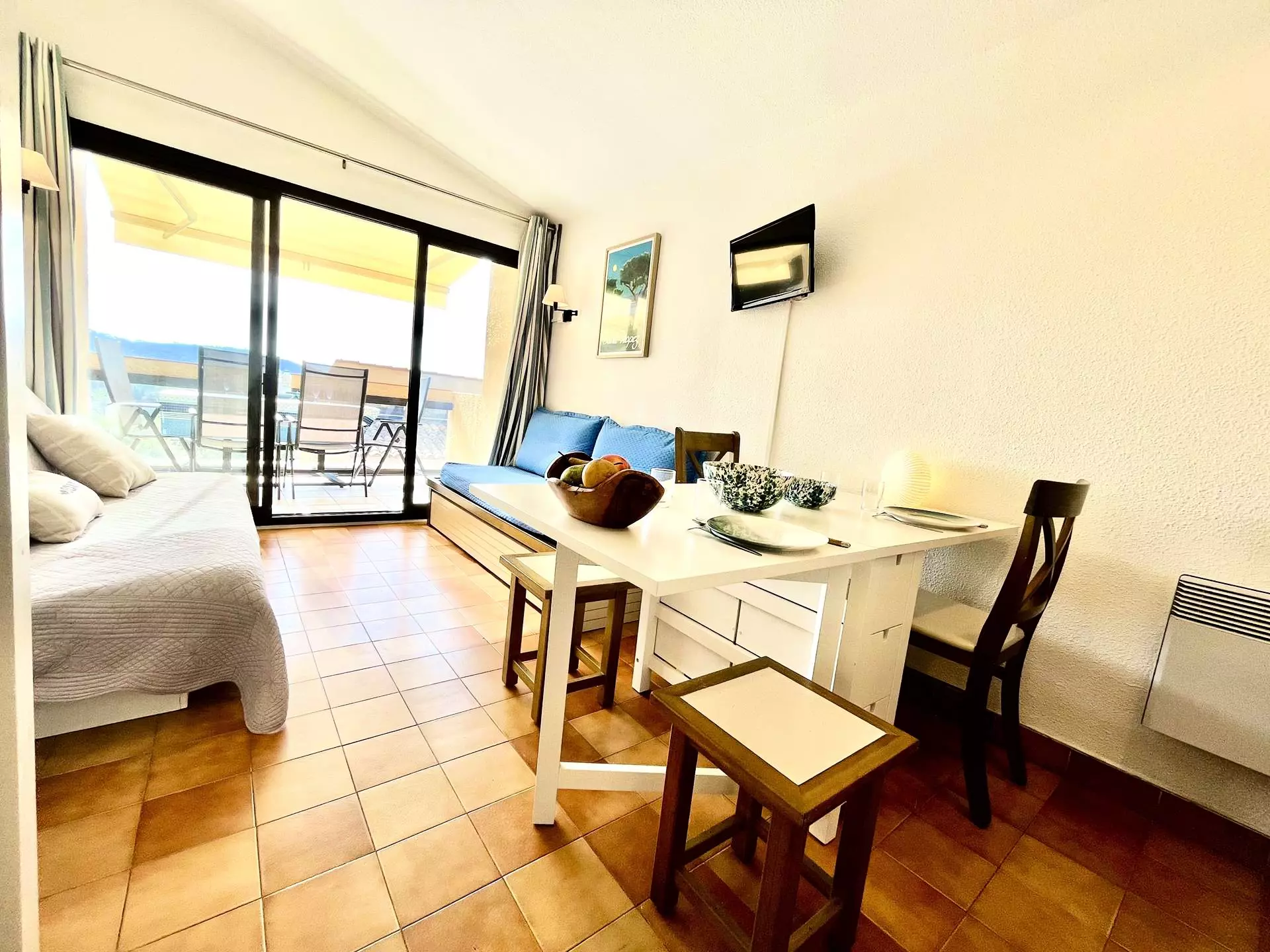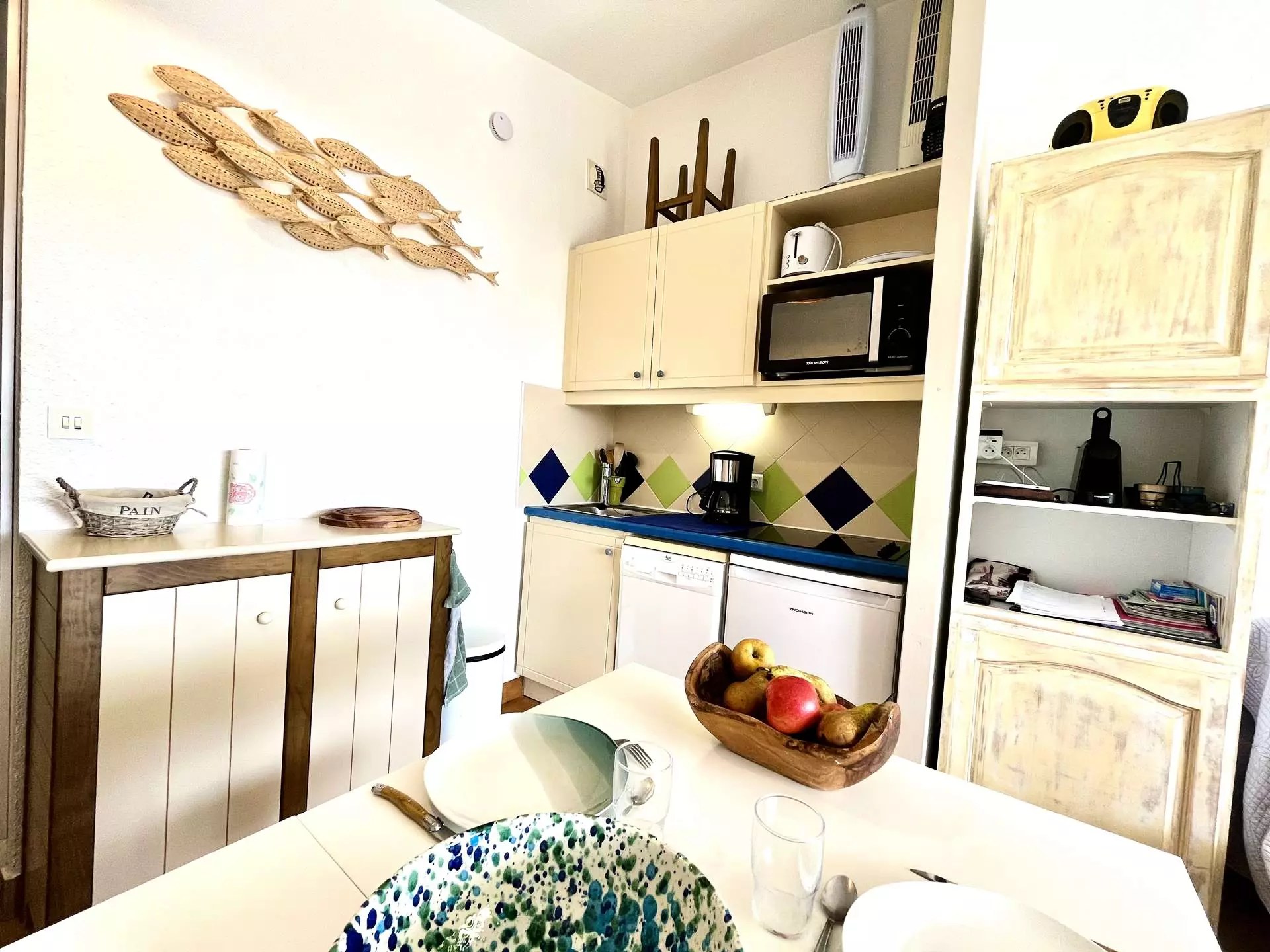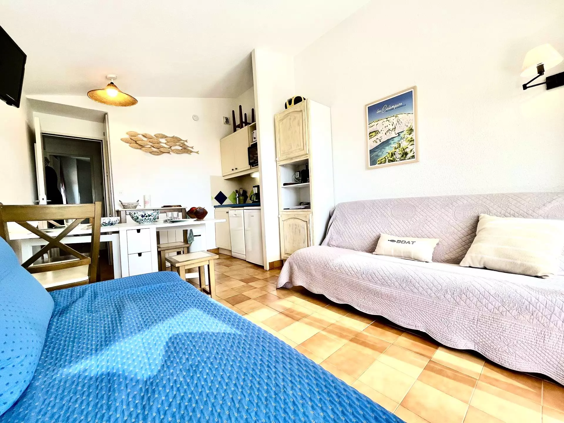 Cet appartement comprend un séjour avec cuisine aménagée et équipée, une chambre avec un lit double pour 2 personnes, dans le séjour un clic-clac pour 2 personnes, une salle de douche avec wc, une terrasse avec un store banne électrique.