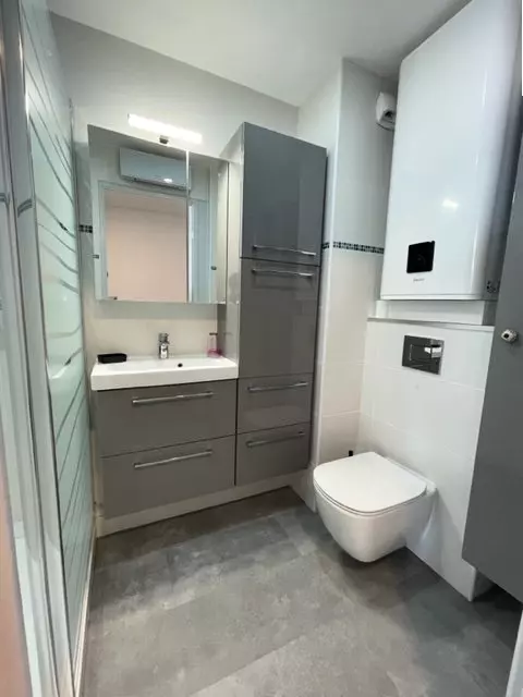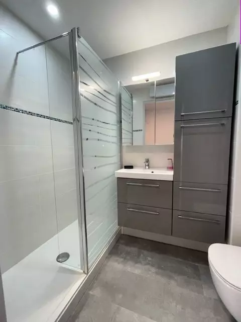 Entrée desservant une chambre séparée avec lit pour 2 personnes et placards avec accès direct sur la terrasse, une salle d'eau avec douche à l'italienne, lavabo et wc.