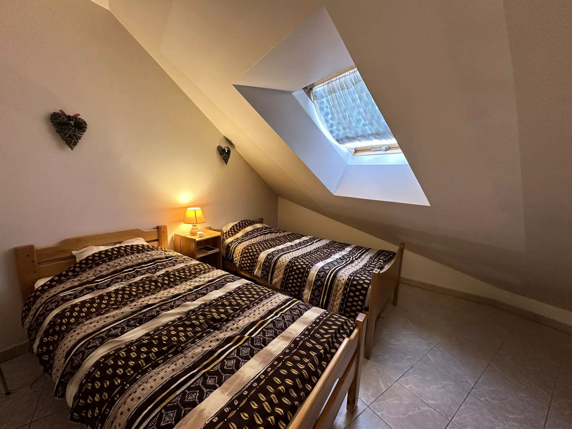 À l'étage deux chambres, une chambre double et une chambre avec deux lits simples, il y a une deuxième salle de bains et un second WC séparé.