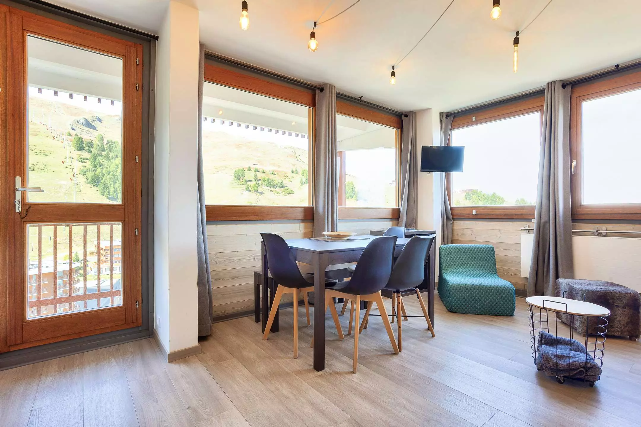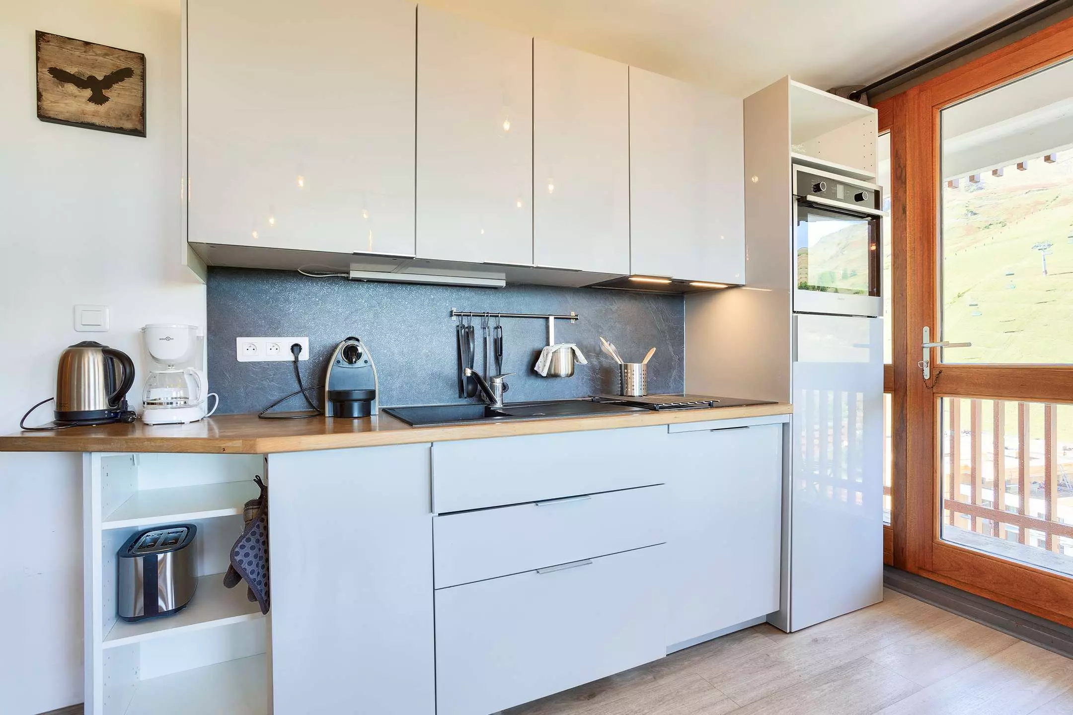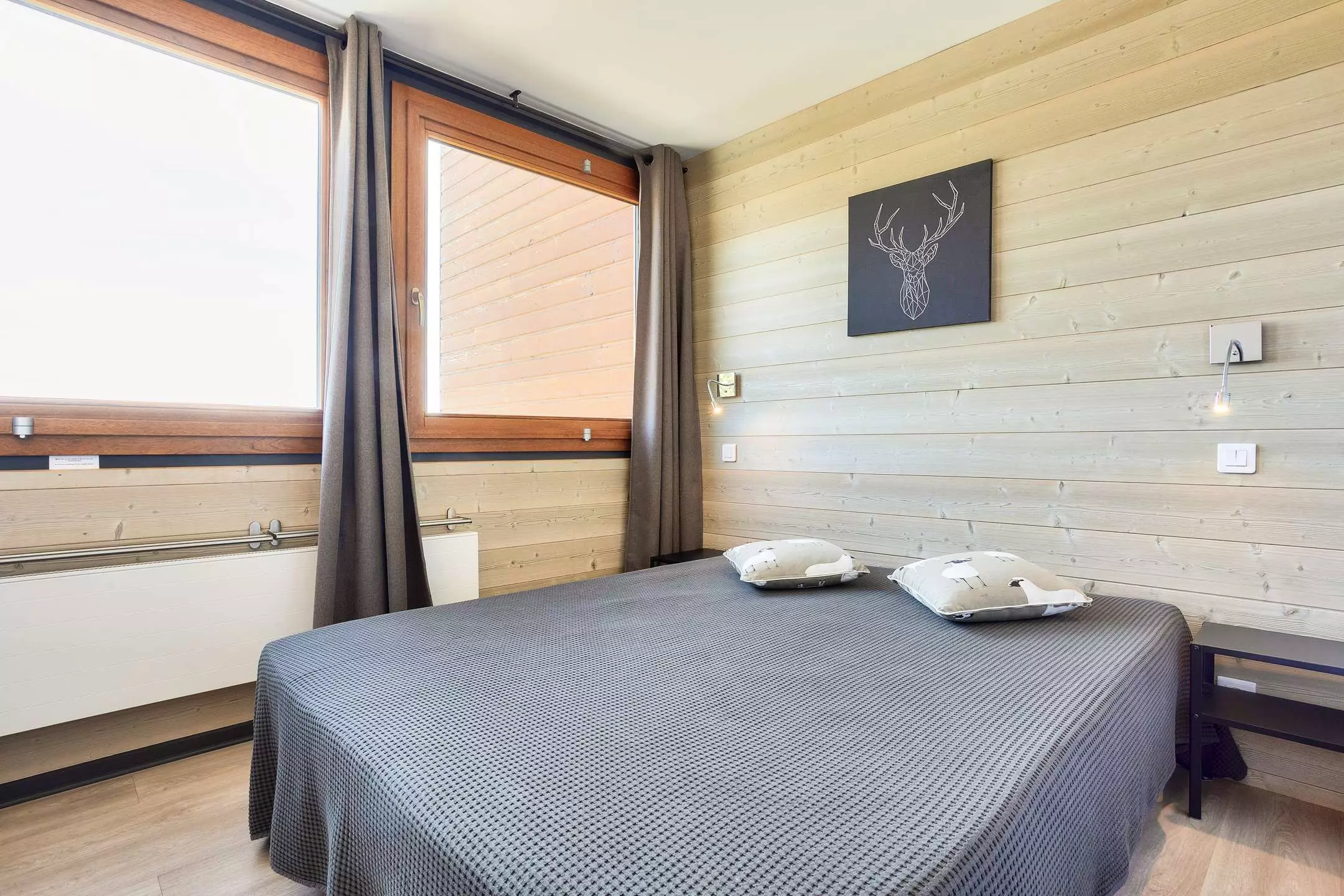 Appartement entièrement refait à neuf, 2/3 pièces, 5/6 pers., 41m2, grand balcon exposé Ouest/Nord, magnifique vue à 180° sur la station, les pistes et le Mont Blanc (appt en angle) - 13ème étage avec ascenseur Cuisine ouverte sur séjour : 3 plaques à induction, réfrigérateur/petit congélateur, four, four Micro-ondes, lave-vaisselle - cafetière elec et Nespresso (capsules non fournies) - Séjour : 2 lits gigognes 1 pers,(banquette), coin salon, coin repas, TV - Chambre : 1 lit double 160cm - Cabine : 2 lits superposés (80cm) - Salle de bains : douche, sèche-serviettes - WC séparés - Les sols : lames PVC -Literie : couettes - WIFI inclus. Appartement non fumeur, animaux non admis. En option et en supplément: Ménage de fin de séjour, draps, serviettes, forfaits ski. -
