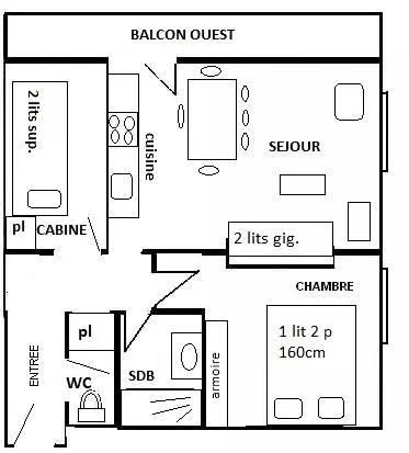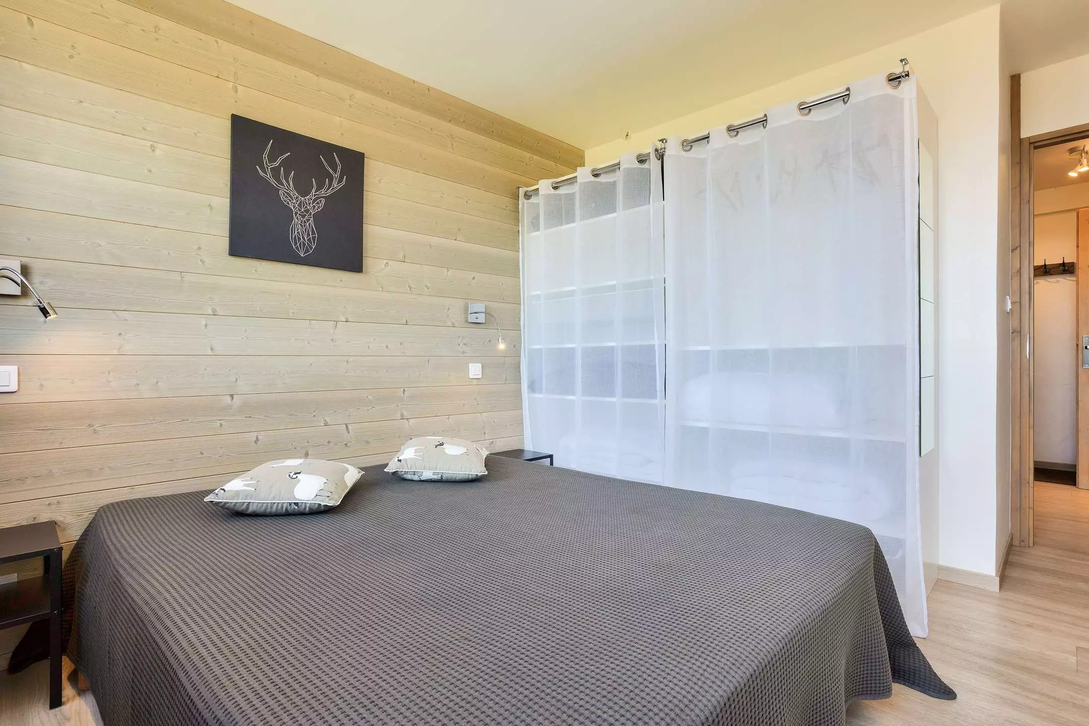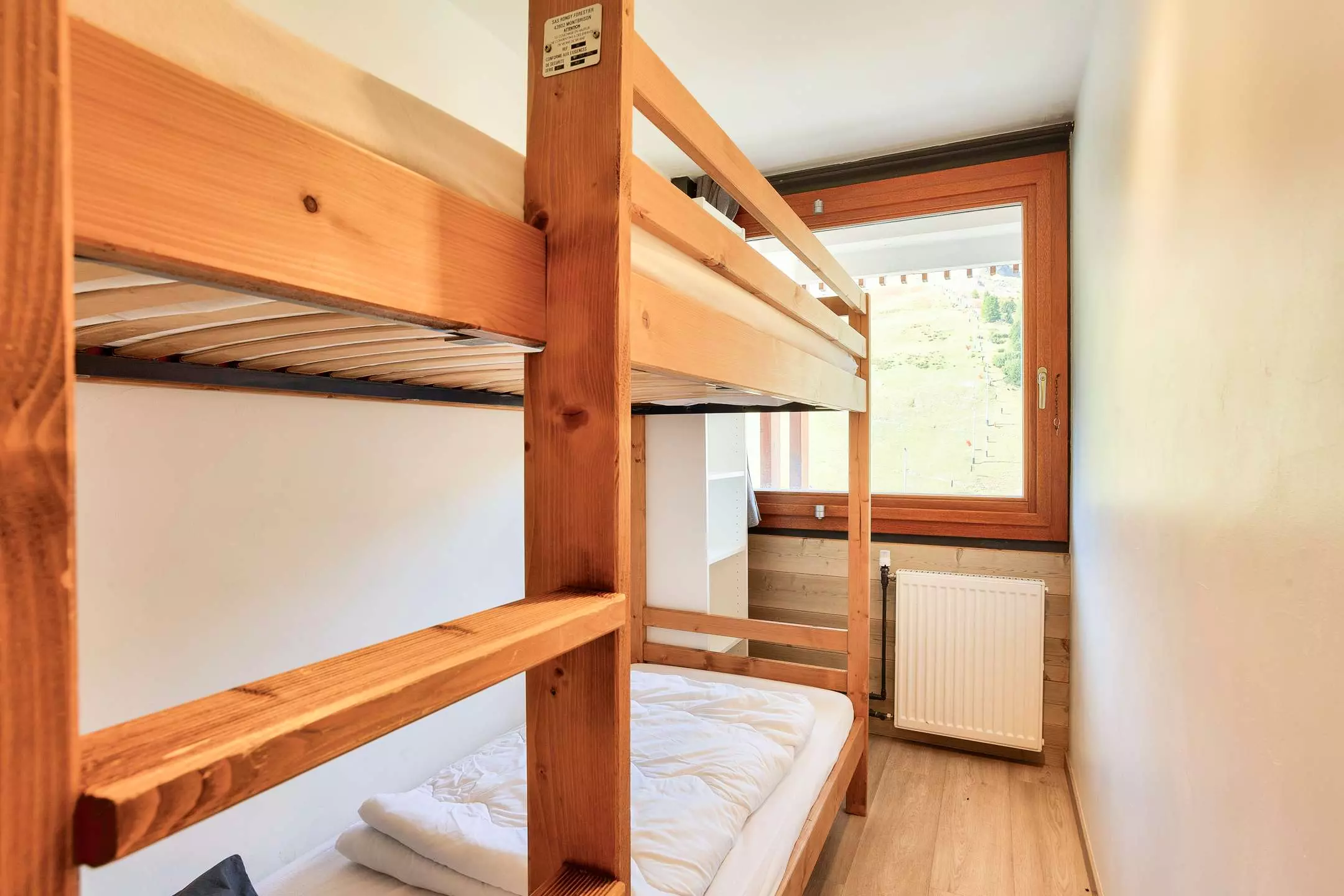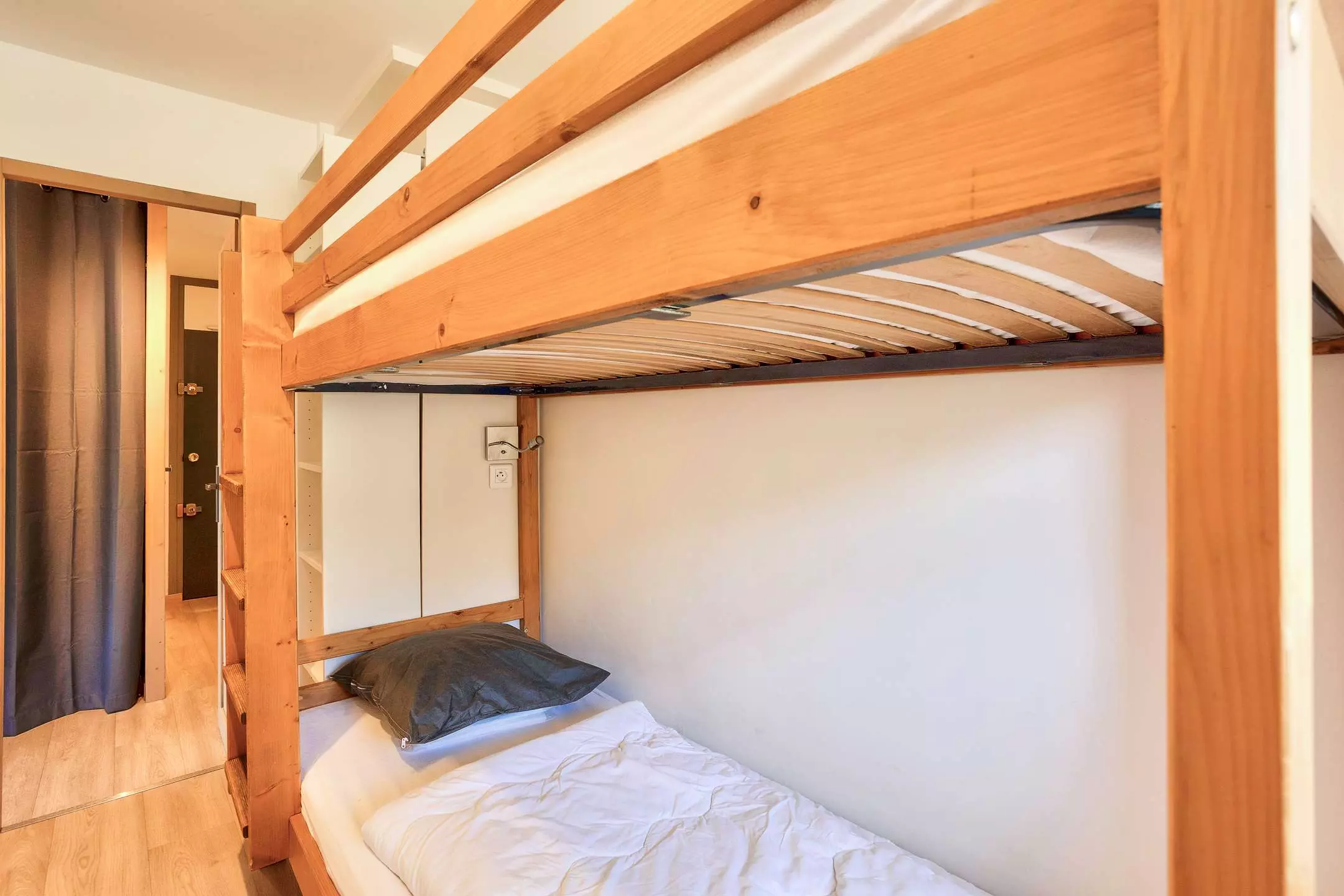 Studio cabine 3/4 pers. 23m2, balcon exposé Sud, vue sur les pistes et la station - 1er étage avec ascenseur - Cuisine dans séjour : cuisinière avec 4 plaques électriques et four et petit lave-vaisselle, réfrigérateur, micro-ondes - Séjour : canapé-lit 2 pers, coin repas, TV - Cabine (avec fenêtre) : 2 lits superposés, TV - Salle de bains : douche - WC inclus. Literie : couvertures + 2 couettes simples. Appartement non fumeur. En option et en supplément: Ménage de fin de séjour, draps, serviettes, forfaits ski.