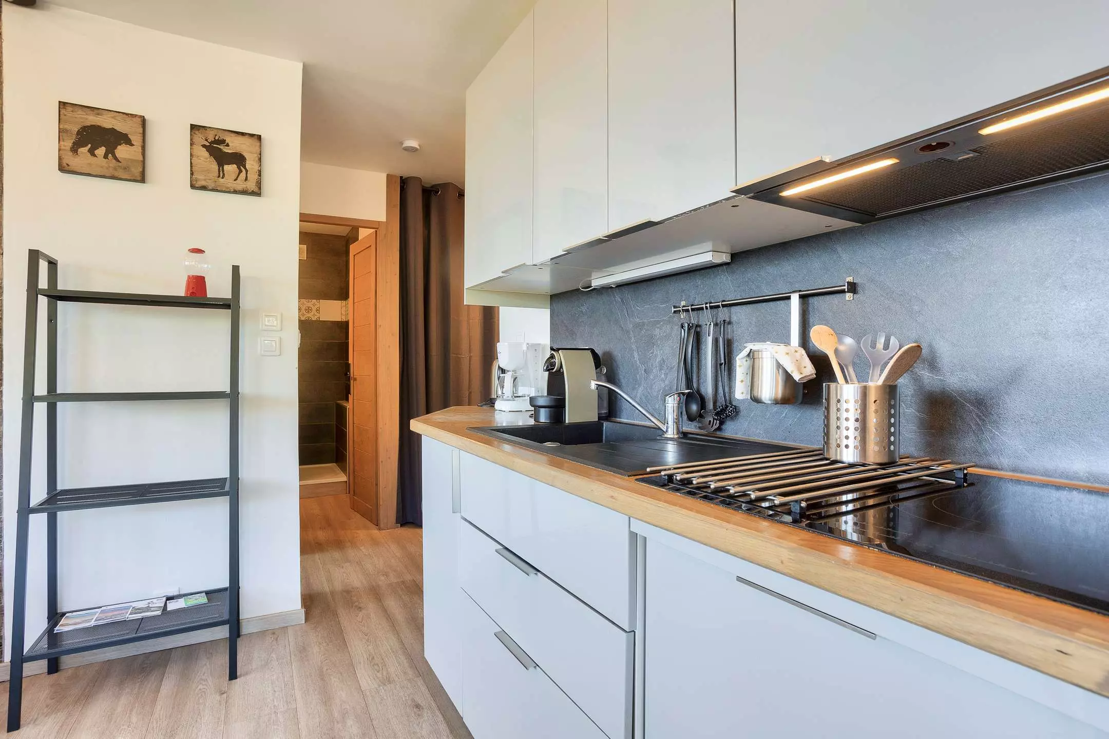 Appartement 2 pièces, 4 pers., 41m2, Balcon exposé Ouest/Nord, vue sur la station et sur le Mont-Blanc - 10ème étage avec ascenseur Cuisine ouverte : cuisinière avec 4 plaques électriques et four traditionnel, four micro-ondes, réfrigérateur grand modèle + partie congélateur, lave-vaisselle, Nespresso - Séjour : canapé-lit 2 pers 140cm (Bedexpress), coin repas, TV - Chambre : lit double 160cm et 1 TV. Salle de bains : douche, lave-linge - WC séparés - Literie : oreillers rectangulaires, 2 couvertures 1 pers et 1 couette 2 pers. Les sols : plastique -.