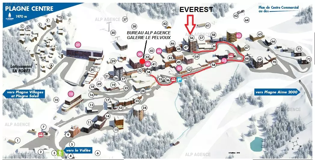 L'EVEREST : résidence de 14 étages située au cœur de la station et au pied des pistes. Accès direct à la galerie commerciale par escaliers.