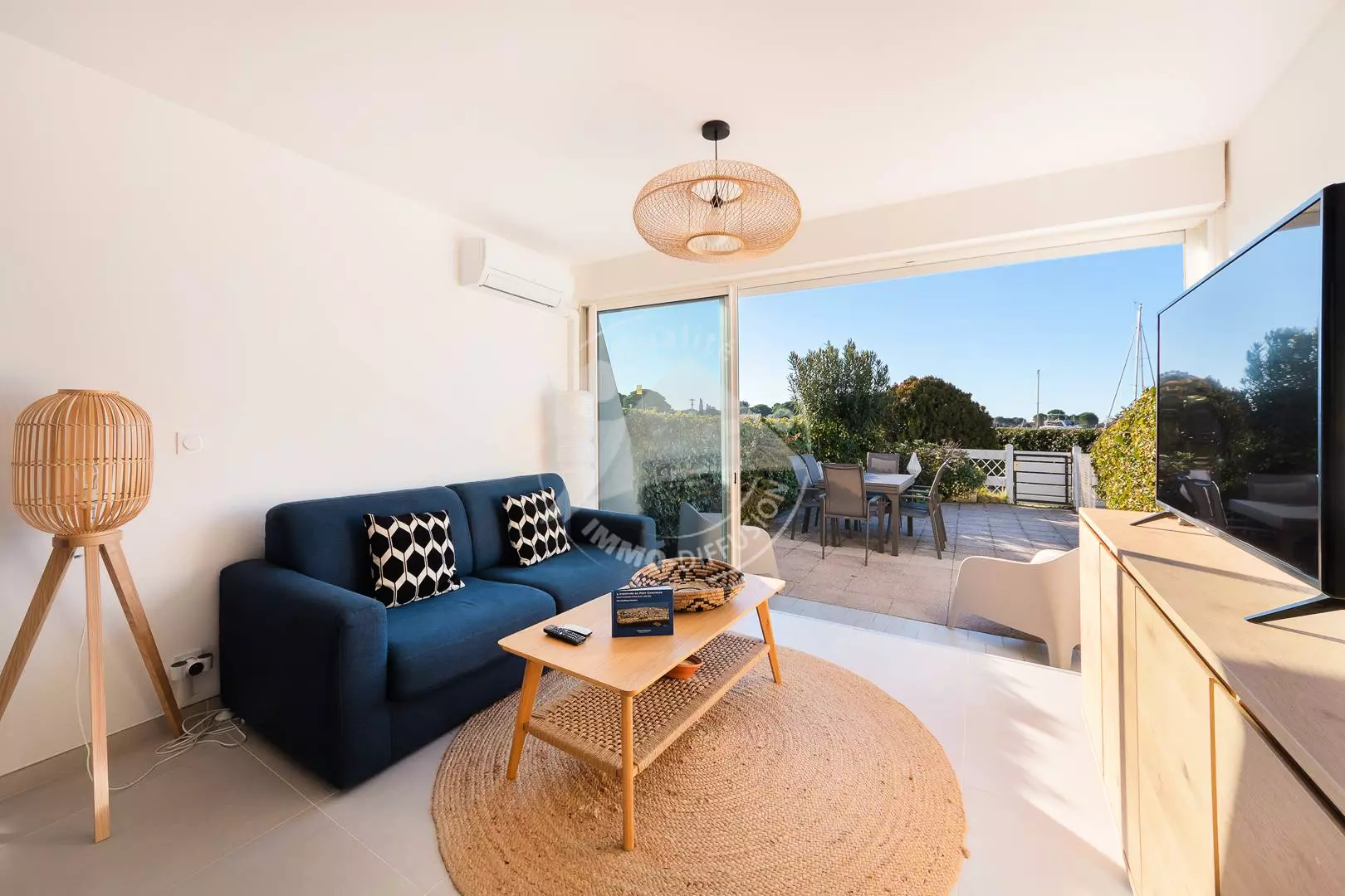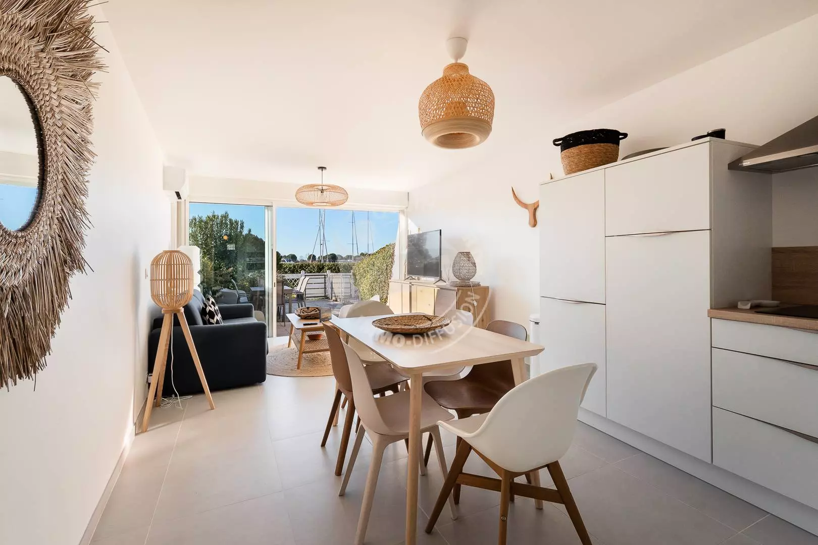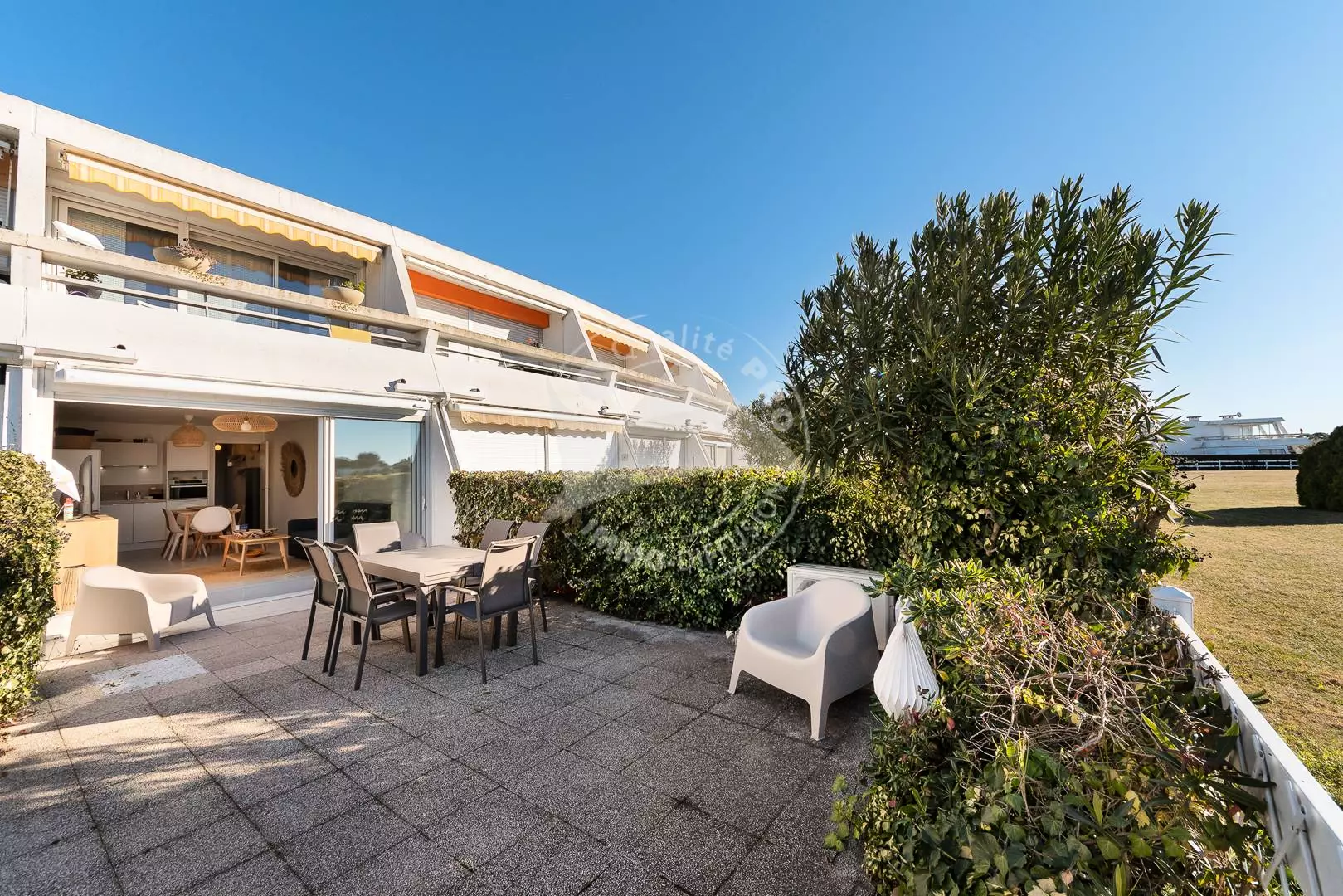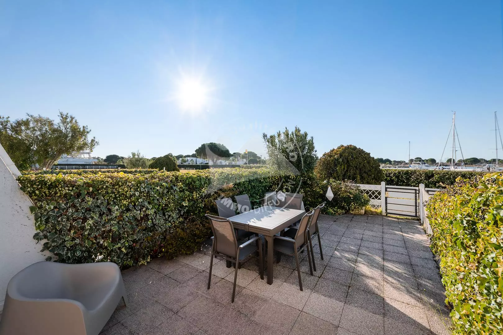PORT CAMARGUE - PLAGE SUD - Résidence de standing sécurisée en bord du chenal. P2 Cabine en rez de jardin de 43m² tout confort avec place de parking privée et numérotée. Un séjour lumineux et spacieux avec climatisation donnant sur un jardin de 30m².Une Cuisine équipée (lave-vaisselle, combiné four/micro-ondes, frigo/congélateur, lave-linge), une cabine avec un lit superposé 2 couchages en 90 cm (Poids maximum 50 kg / âge minimum 6 ans), une chambre avec un lit en 140 cm, une salle d'eau et un wc séparé .Grand jardin côté chenal avec belle vue sur les bateaux. Proximité centre commercial, plage, activités sportives et thalassothérapie. Équipée pour 4 personnes. Animaux non admis.