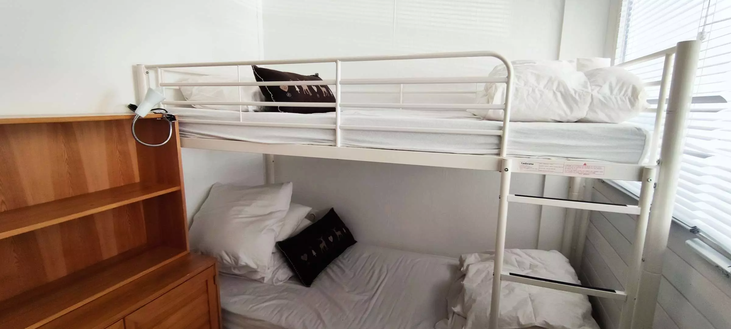 1 canapé lit clic clac140 et 2 lits superposés (réservés aux enfants, ne conviennent pas aux adultes), salle de bains avec lave linge/sèche linge, balcon. NON FUMEUR. Pas d'internet.