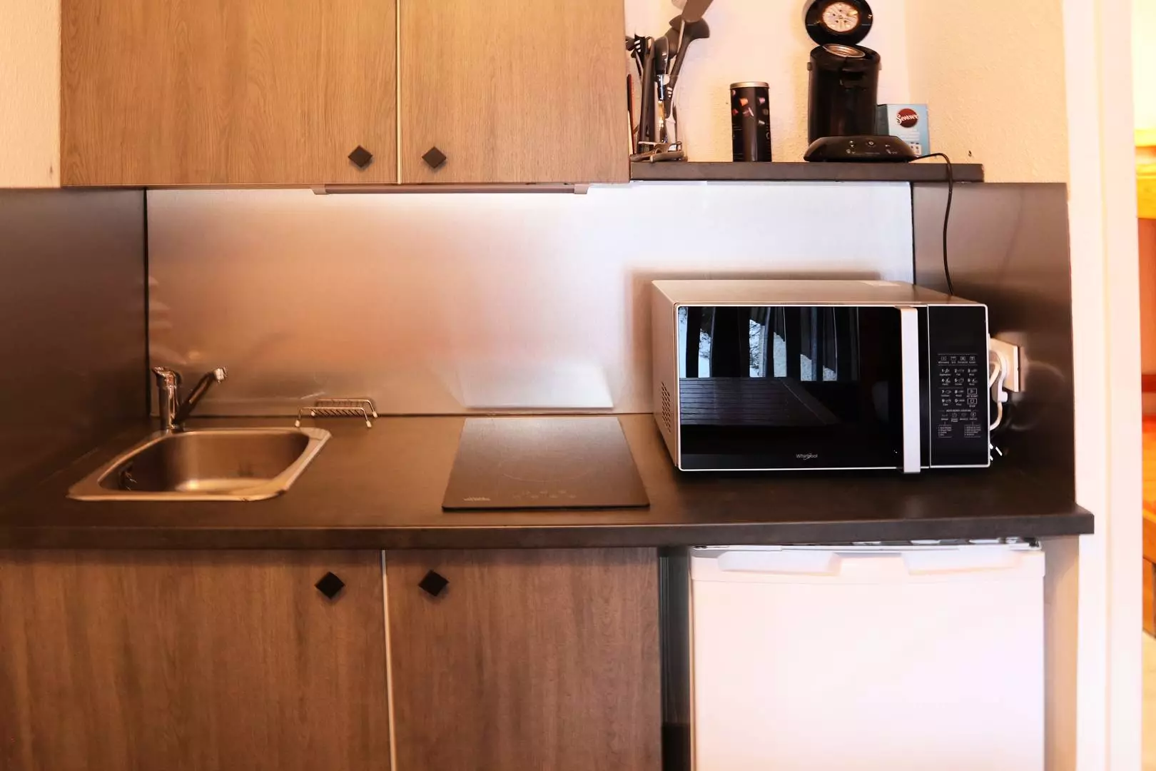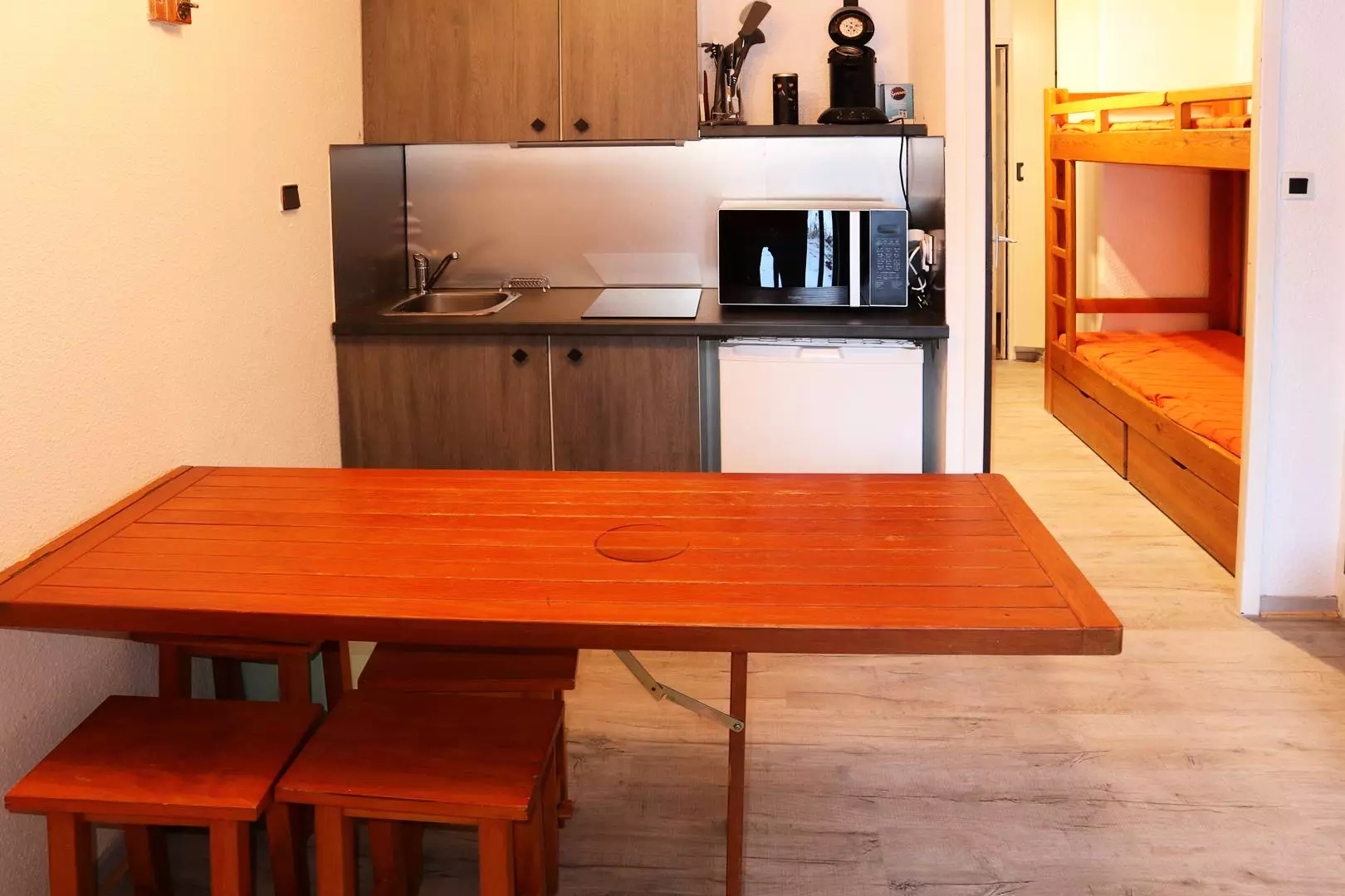 Studio équipé pour 4 personnes au 2ème étage de la résidence, situé au centre de la station avec accès direct aux pistes et aux commerces, comprenant une entrée avec 2 lits superposés 1 place, un séjour avec 1 Banquette convertible 2 places, un coin cuisine ouvert sur le séjour, une salle de bains et wc séparés. Balcon exposition Nord/Est vue sur la vallée. Départ et retour skis aux pieds. Idéale pour une famille.