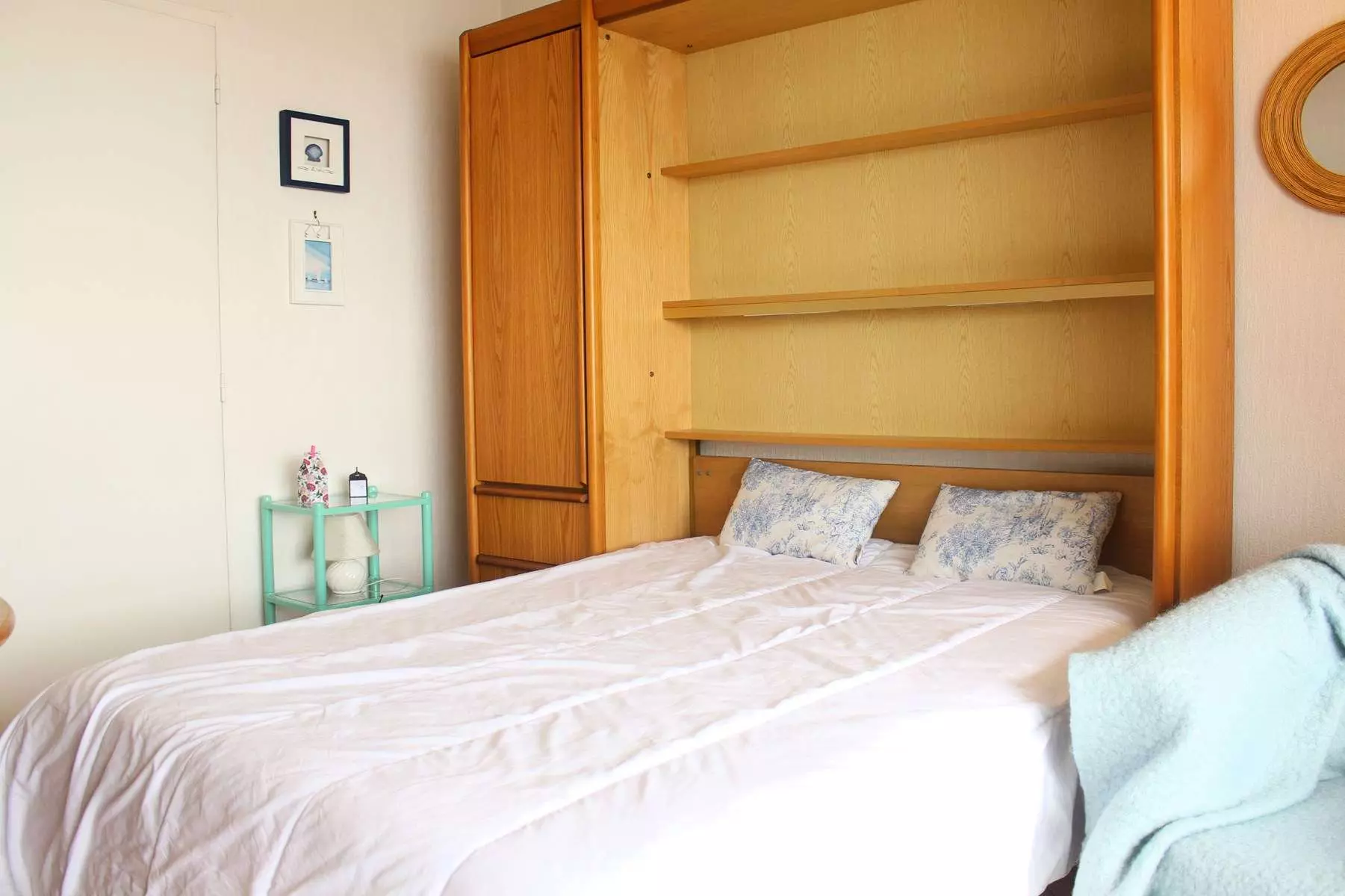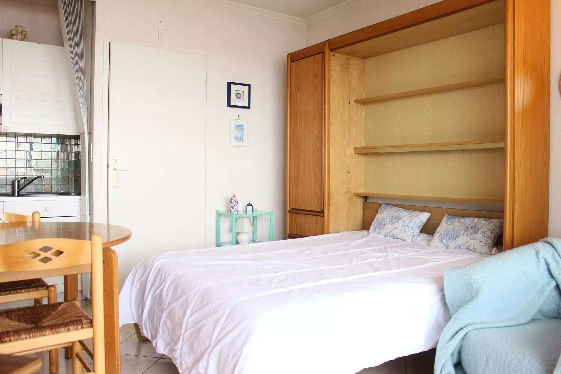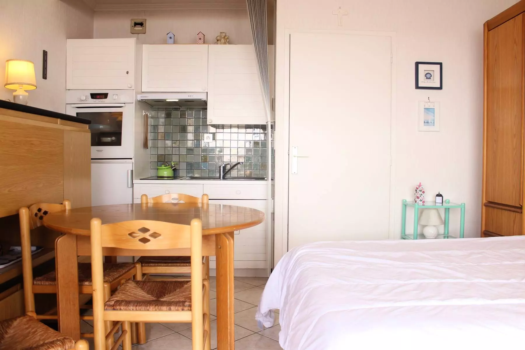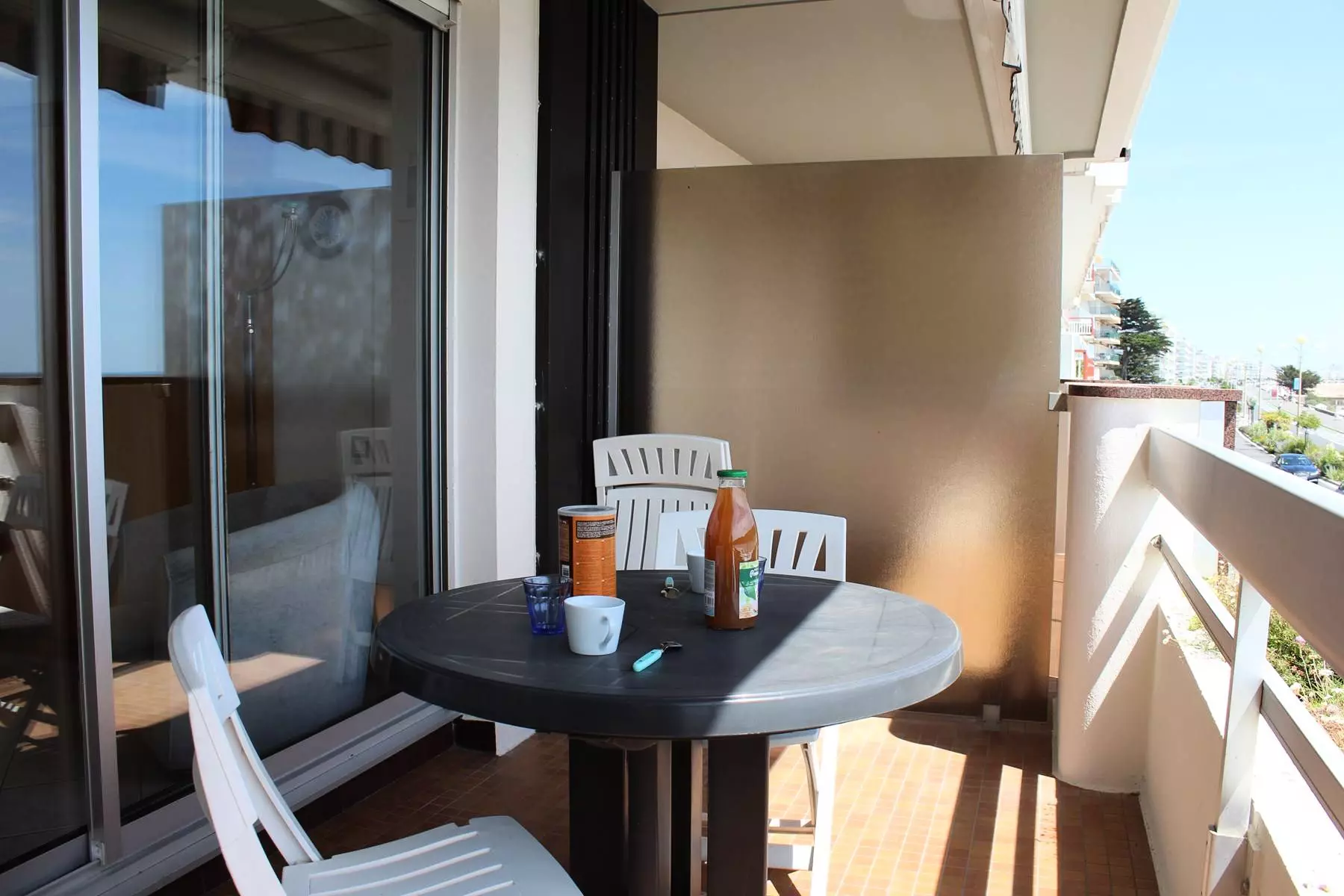 Le logement : Cet agréable studio situé entre l'avenue du Général de Gaulle et Aquabaule est équipé d'une entrée avec coin cabine (lits superposés) et rangements, d'un séjour lumineux avec une petite cuisine avec tout les éléments essentiels pour 4 personnes, une table et 4 chaises, et un lit rabattable très facilement qui permet d'avoir de la place en journée, d'une terrasse face à la mer avec salon de jardin et store banne, et d'une salle de bains.