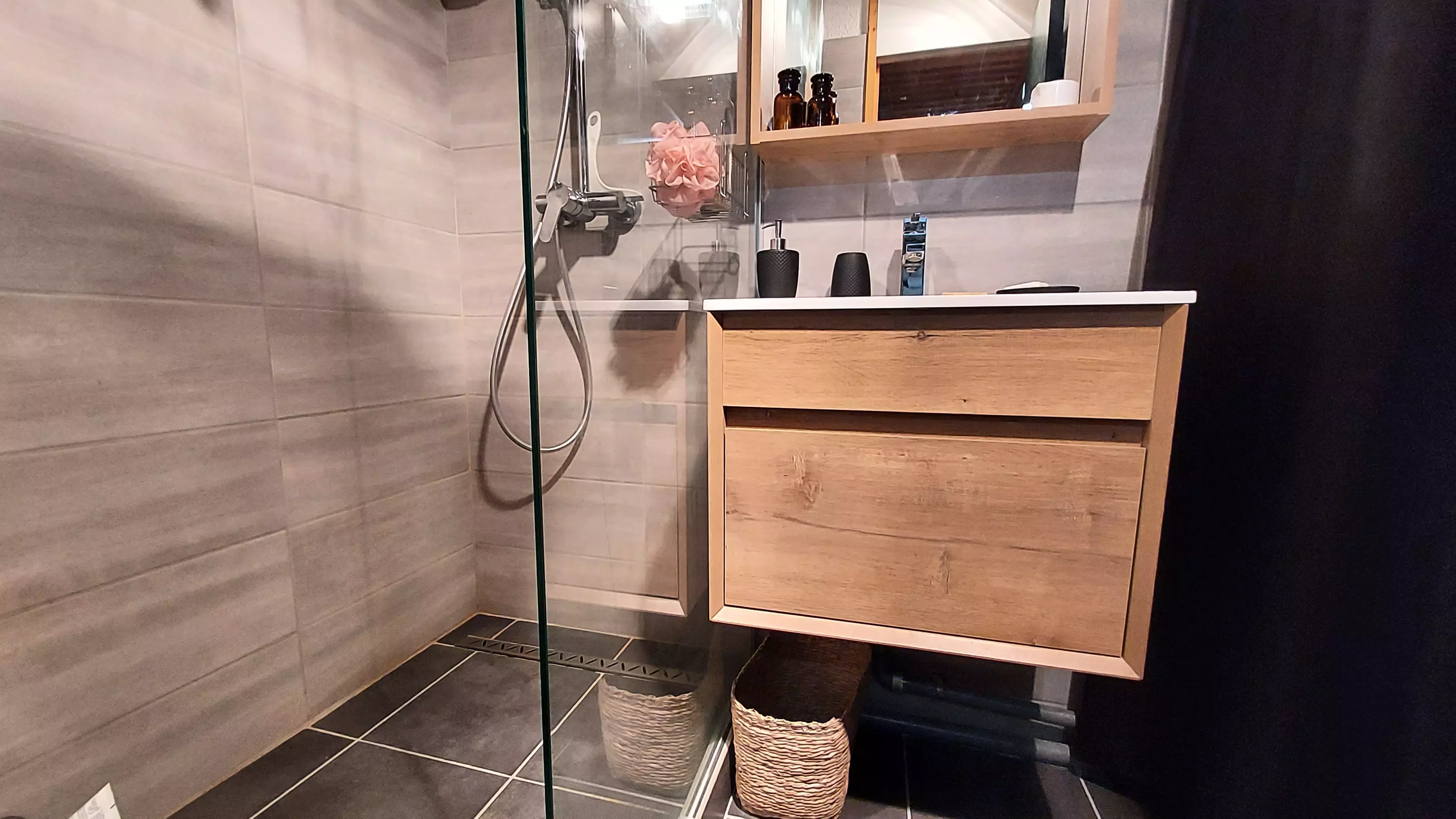 Salle de douche italienne, toilettes indépendantes, grand balcon équipé d'une table de jardin.