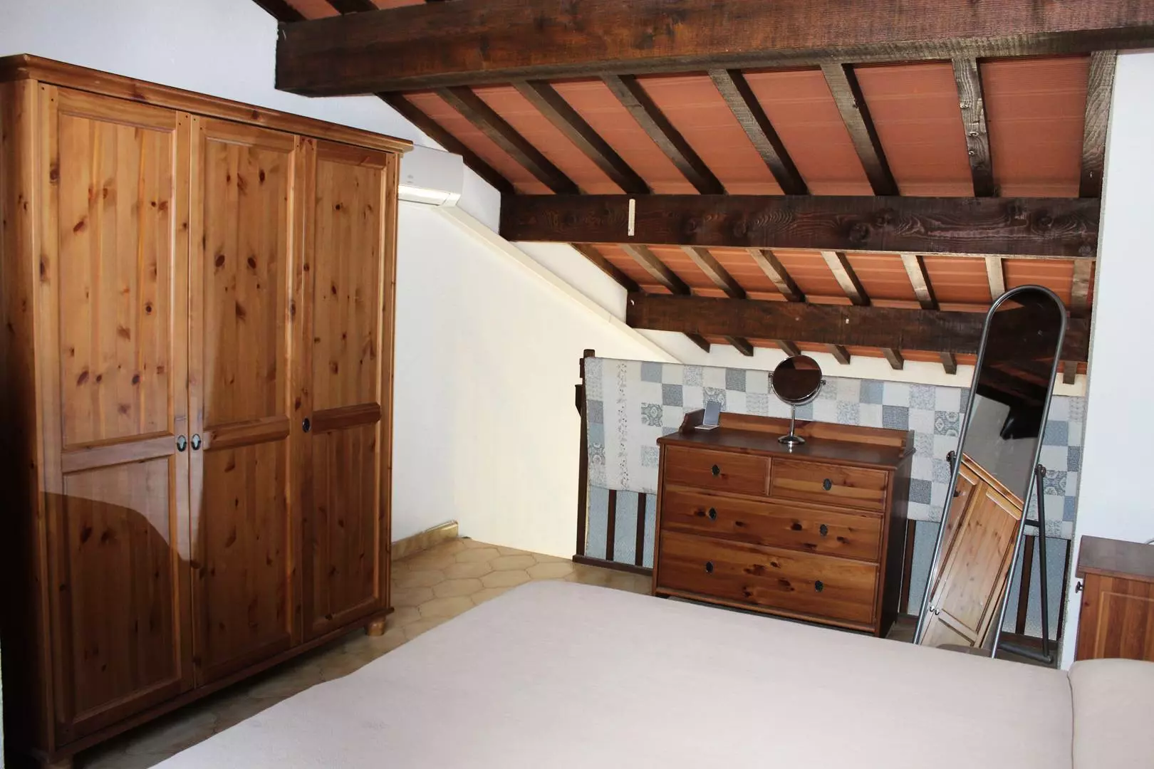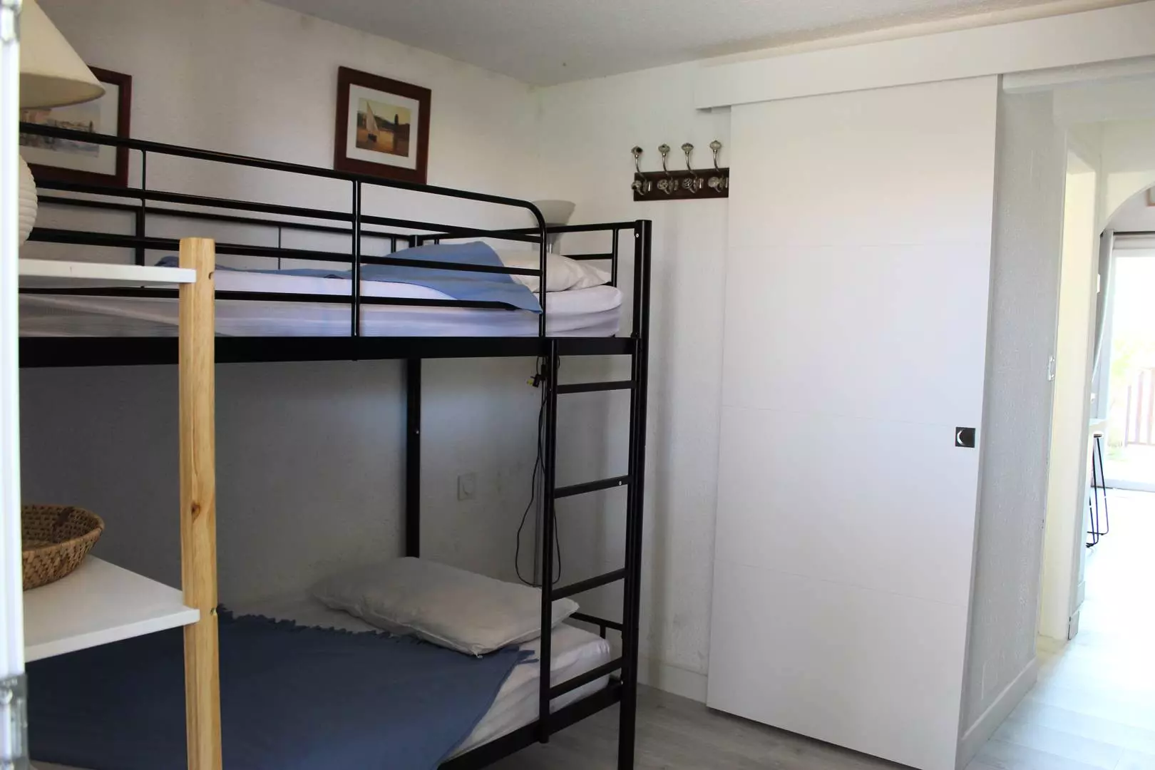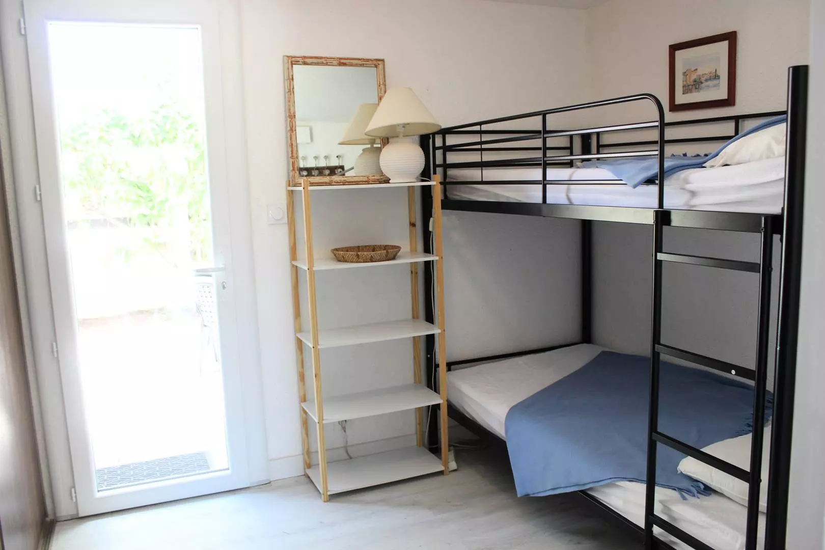 Chambre avec lit superposé en 90 et grand placard de rangement.