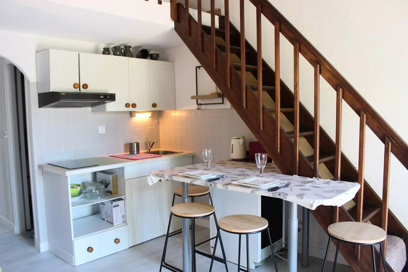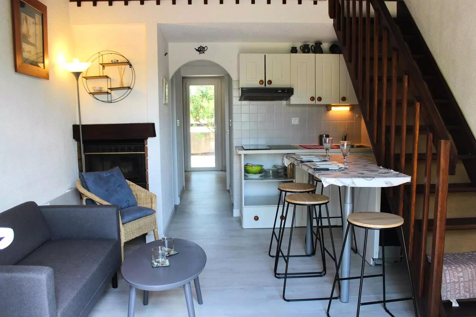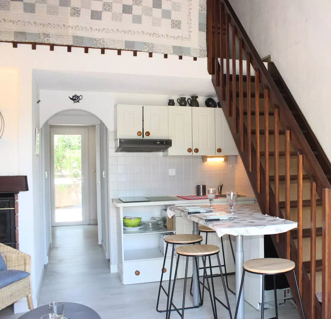 RDC : Salon avec canapé non convertible et TV - Cuisine ouverte équipée (2 plaques induction, réfrigérateur/congélateur, lave vaisselle,micro onde, cafetière filtres, bouilloire, gril pain..)