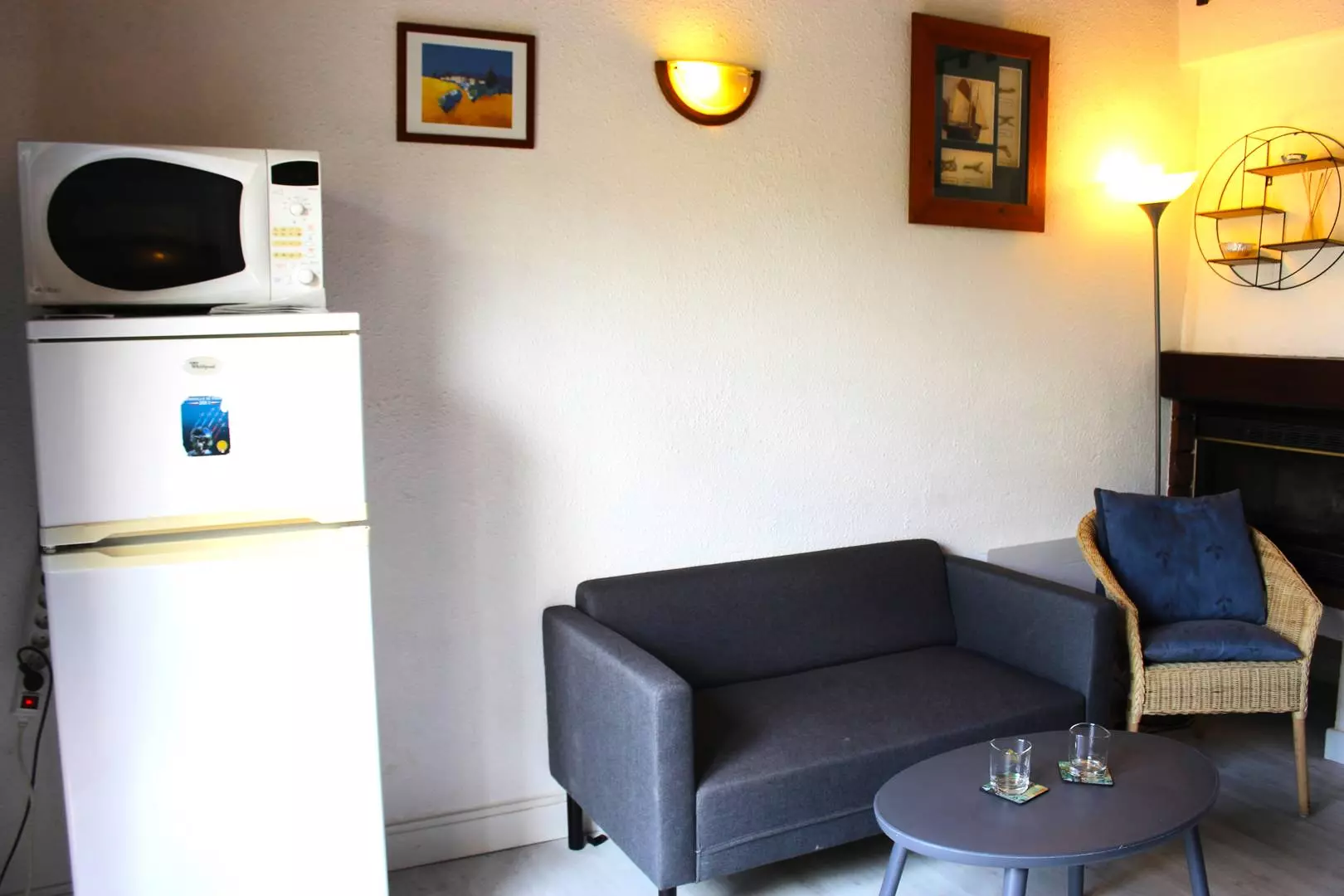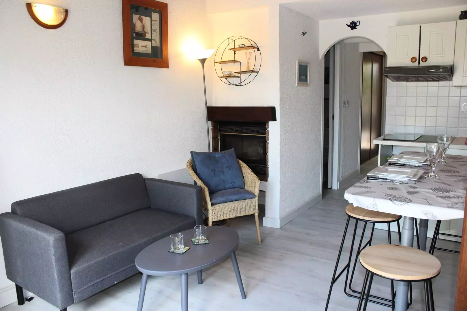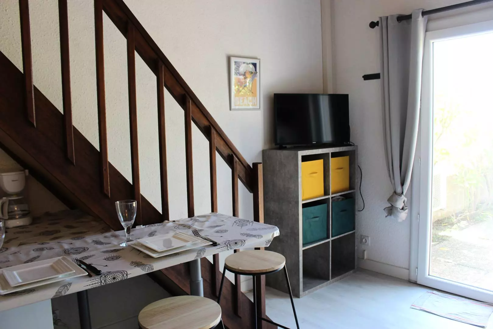 RDC : Salon avec canapé non convertible et TV - Cuisine ouverte équipée (2 plaques induction, réfrigérateur/congélateur, lave vaisselle,micro onde, cafetière filtres, bouilloire, gril pain..)