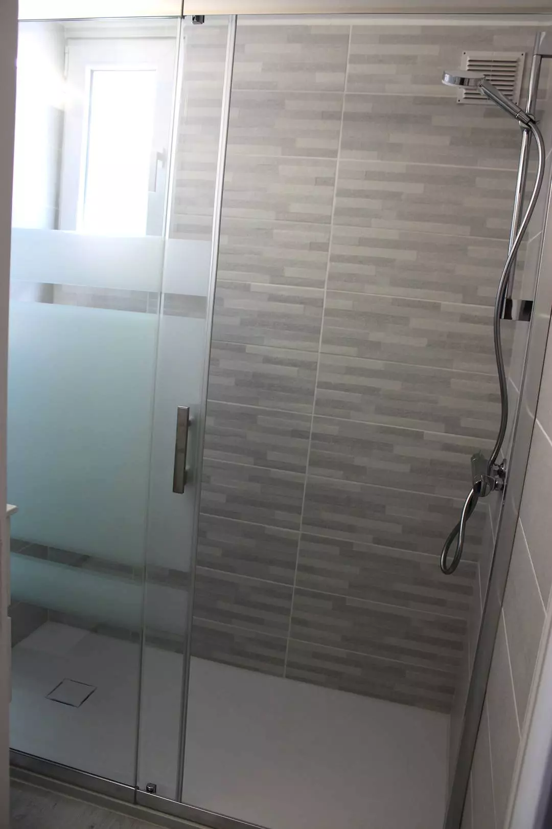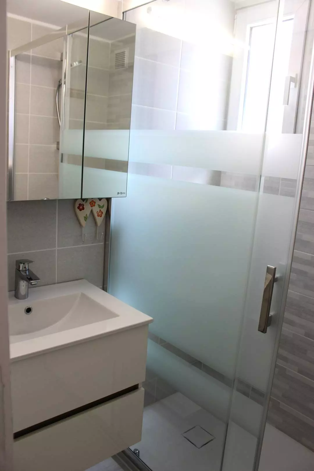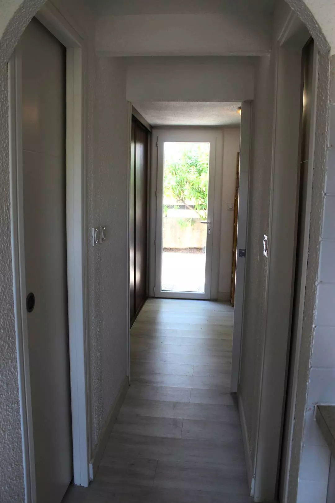 Couloir qui dessert un W.C indépendant avec lave linge et une salle d'eau rénovée avec douche à l'italienne.