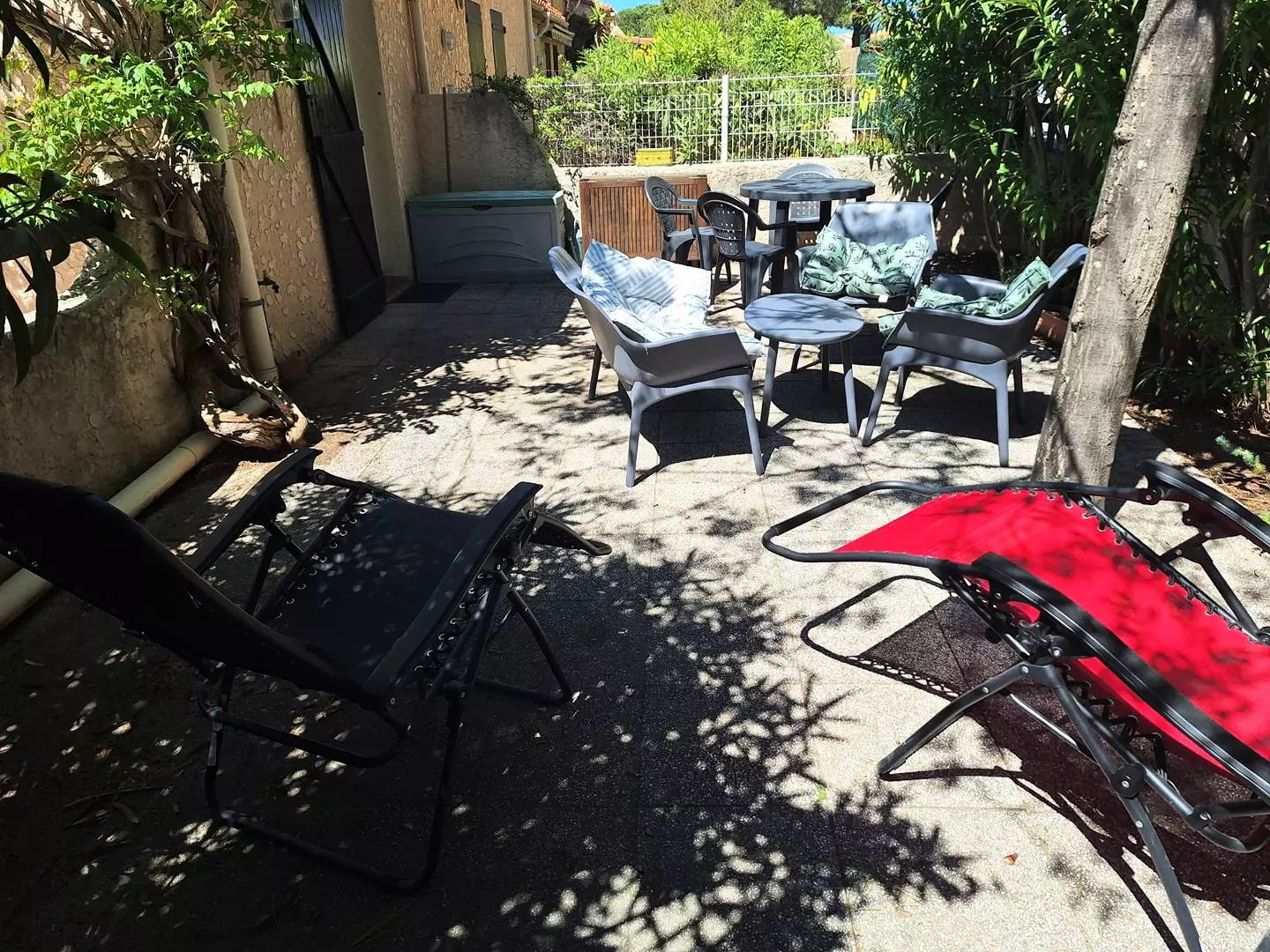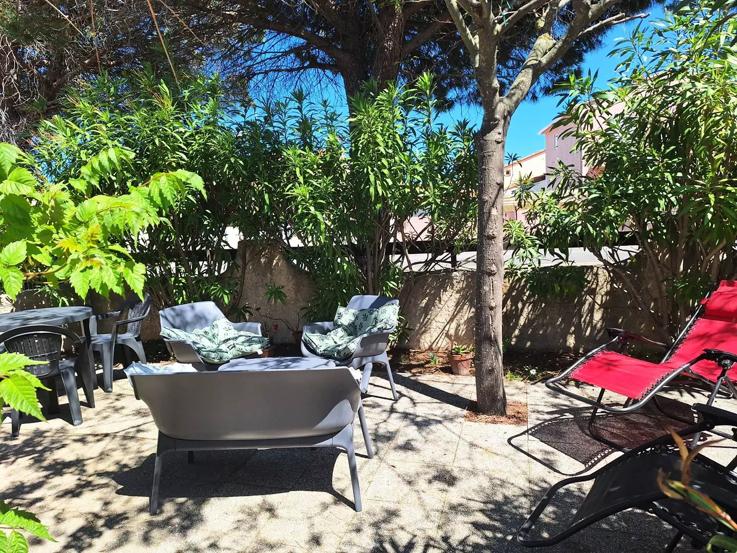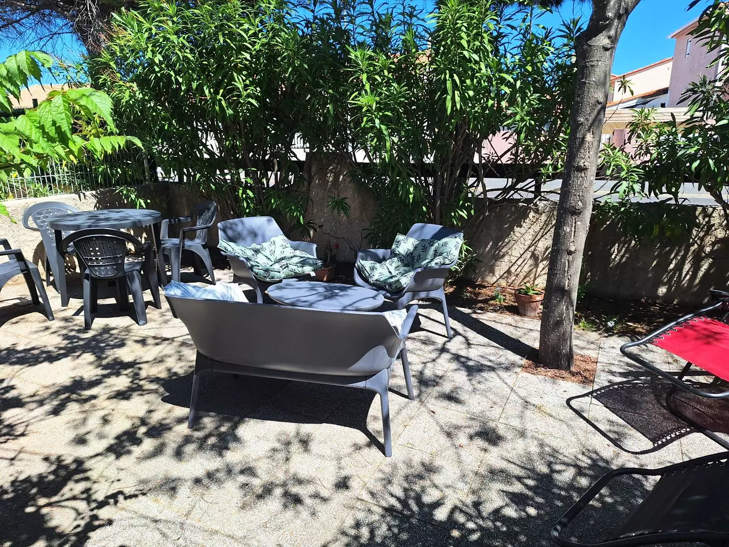 Accès à la grande cour clôturée équipée d'un salon de jardin, store banne ainsi que de chaises longues.