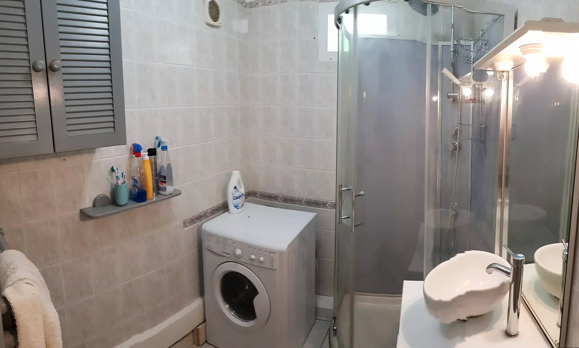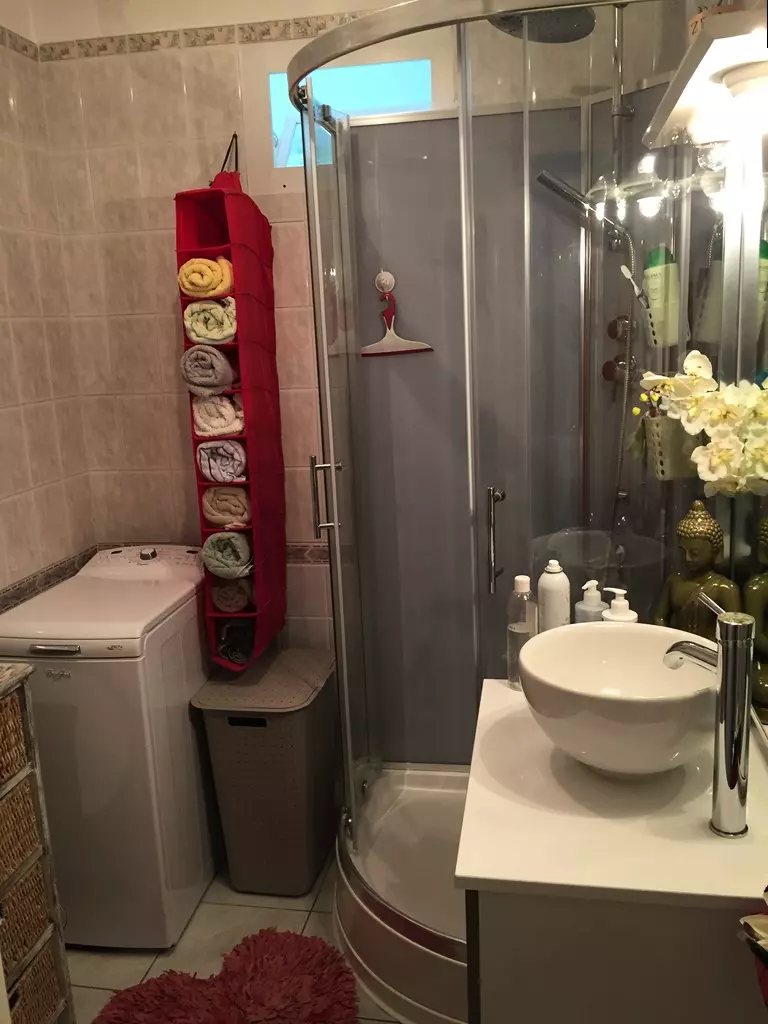 Une salle d'eau avec cabine de douche, meuble vasque et machine à laver