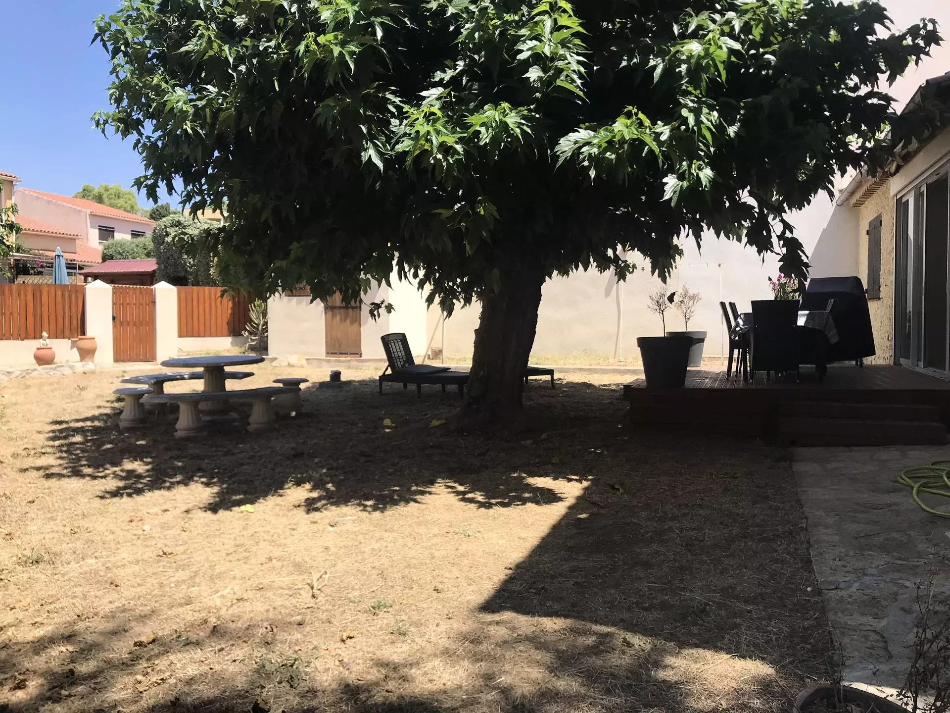Le jardin est agrémenté d'une terrasse ombragée, avec salon de jardin, équipée d'une belle plancha.