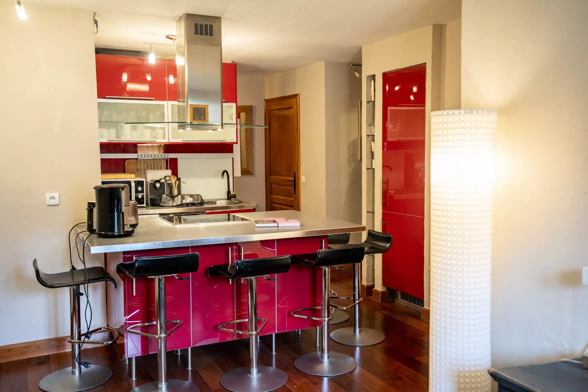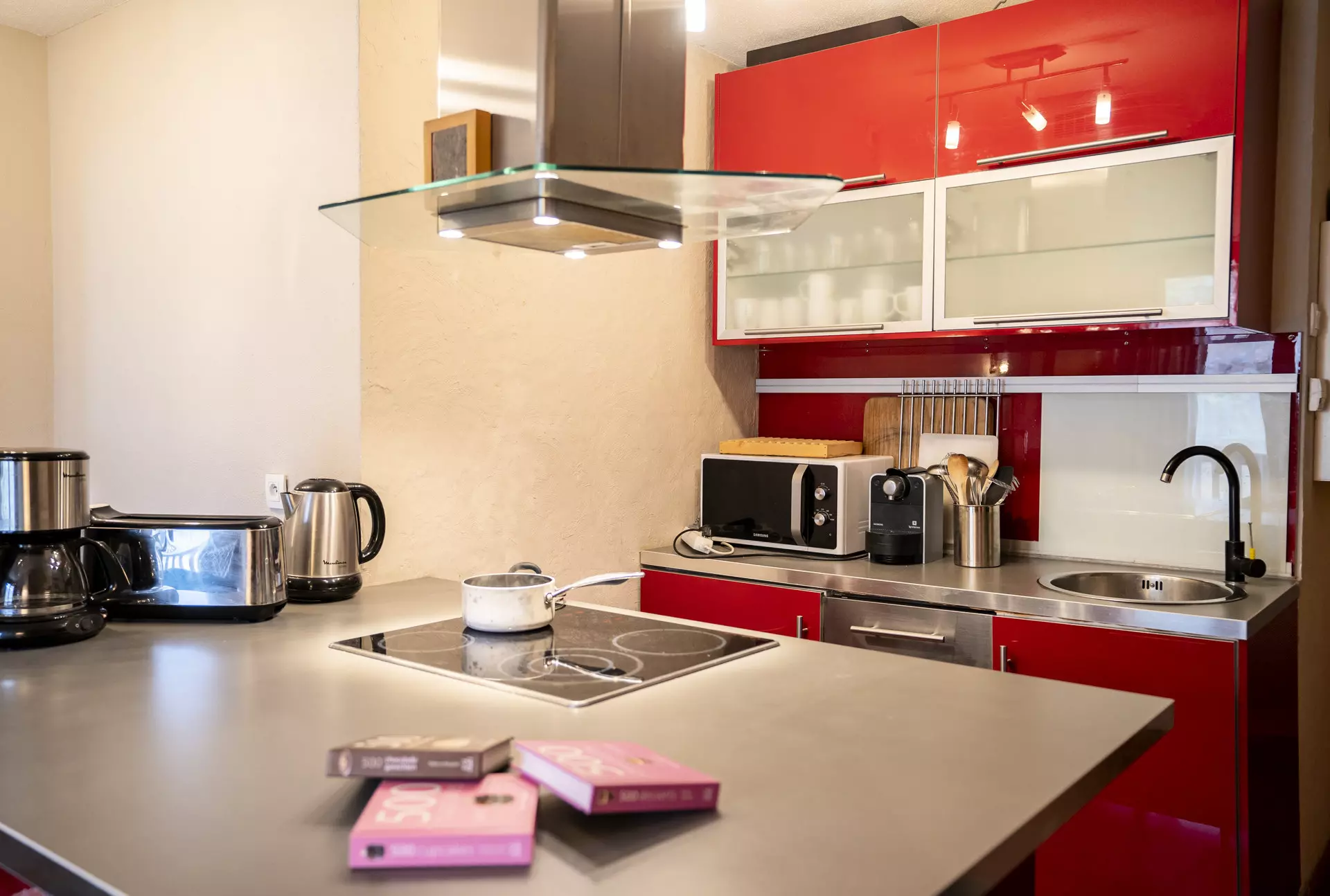 Coin cuisine : micro-onde, four, plaques vitrocéramiques, réfrigérateur et lave-vaisselle, lave linge