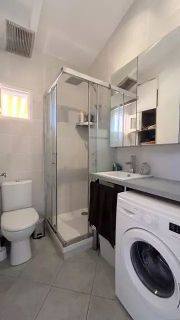 Une salle d'eau avec douche et lave-linge et WC.
