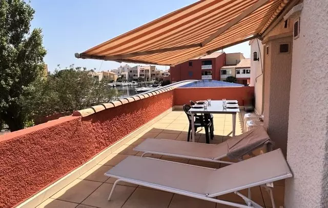 Une séjour avec baie vitrée donnant sur une grande terrasse vue sur la canal, petit barbecue et store manuel.