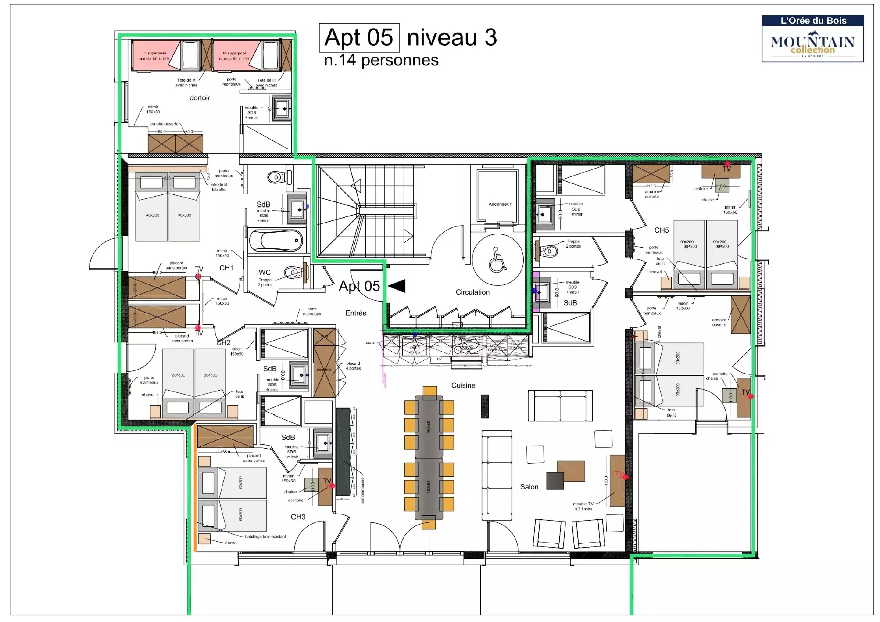 Appartement 6 pièces pouvant accueillir jusqu'à 14 personnes, situé au 3e étage de l'Orée du Bois. Ce logement moderne et bien aménagé offre tout le confort pour passer un séjour inoubliable en famille ou entre amis, avec un espace de vie spacieux de 50 m².