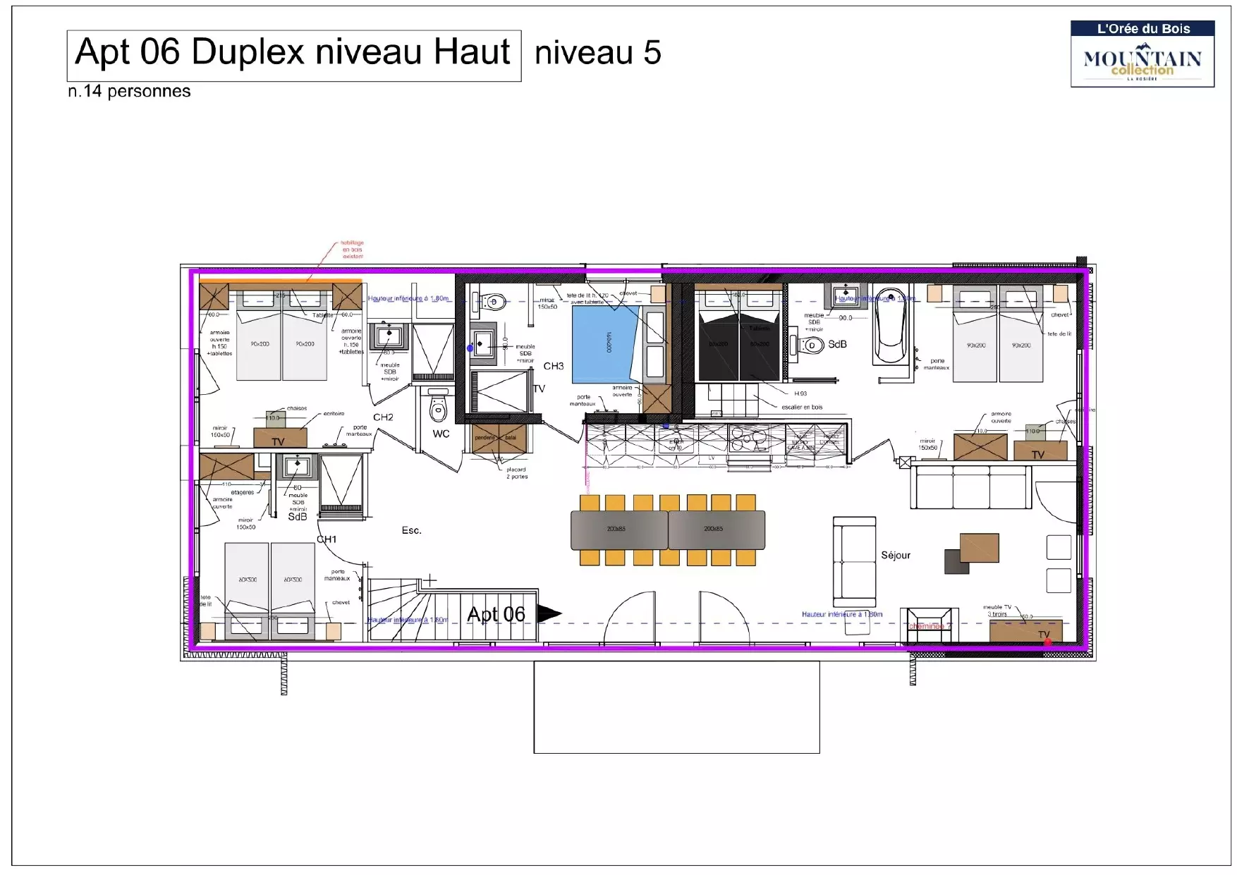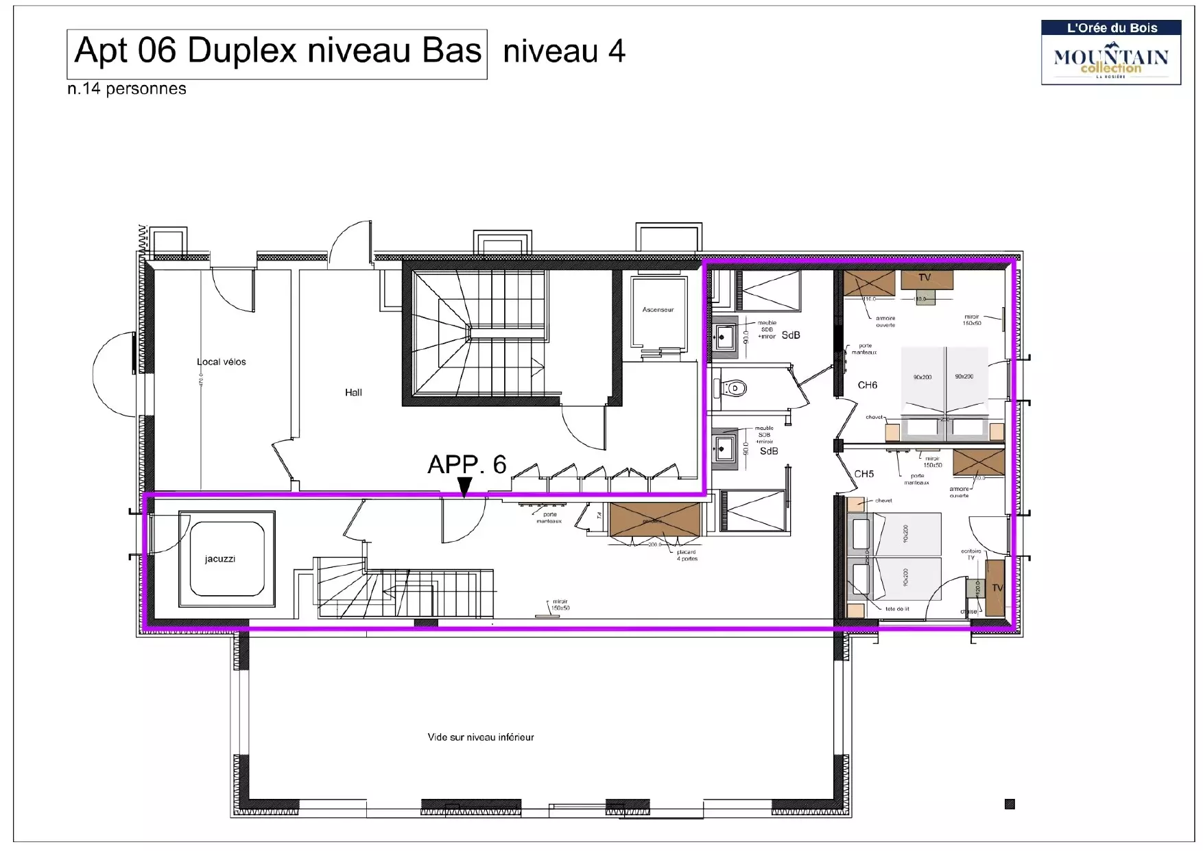 Appartement 7 pièces pour 14 personnes en duplex situé au niveau 3 de l'Orée du bois, ce logement élégant offre tout le confort nécessaire pour des vacances mémorables en famille ou entre amis avec son espace de vie de 60m².