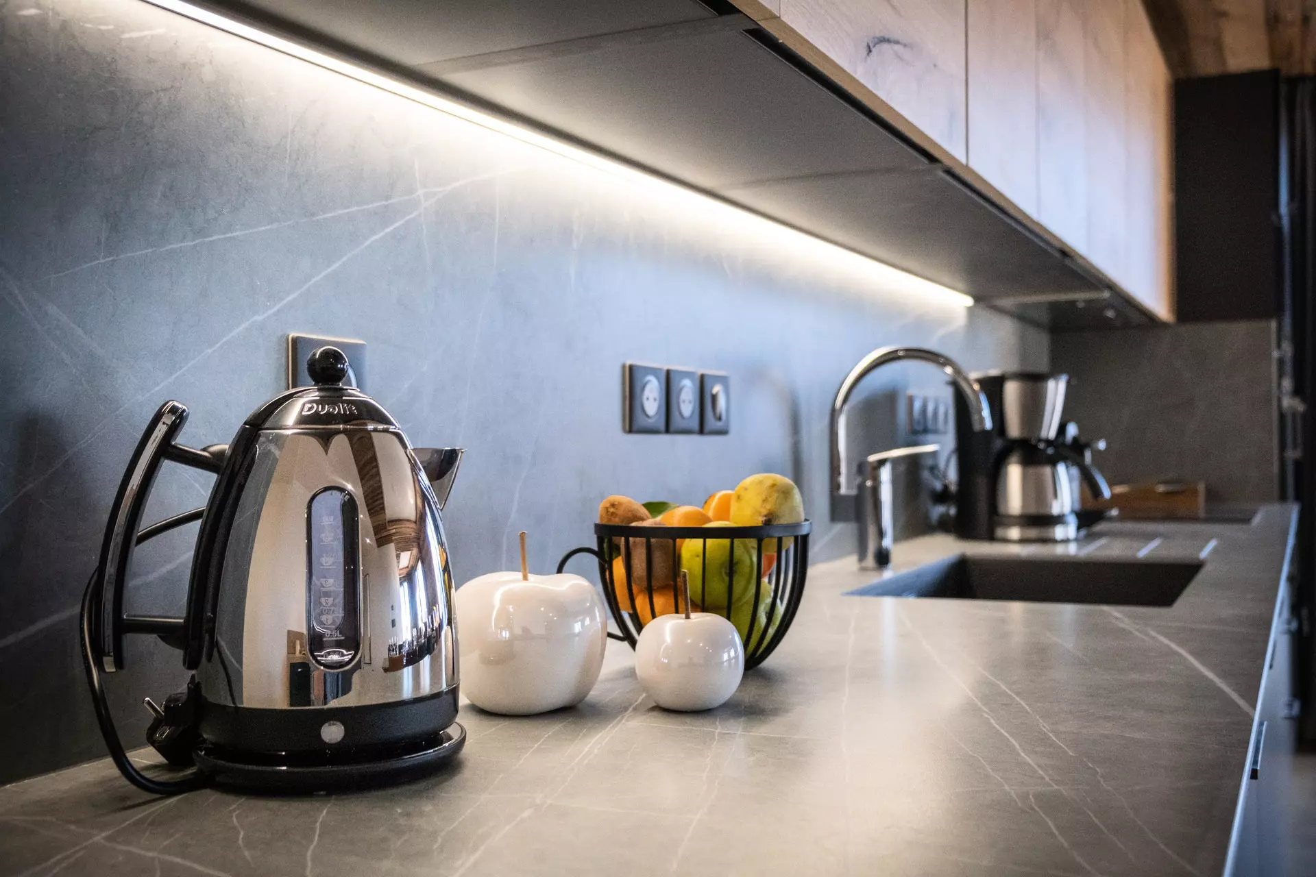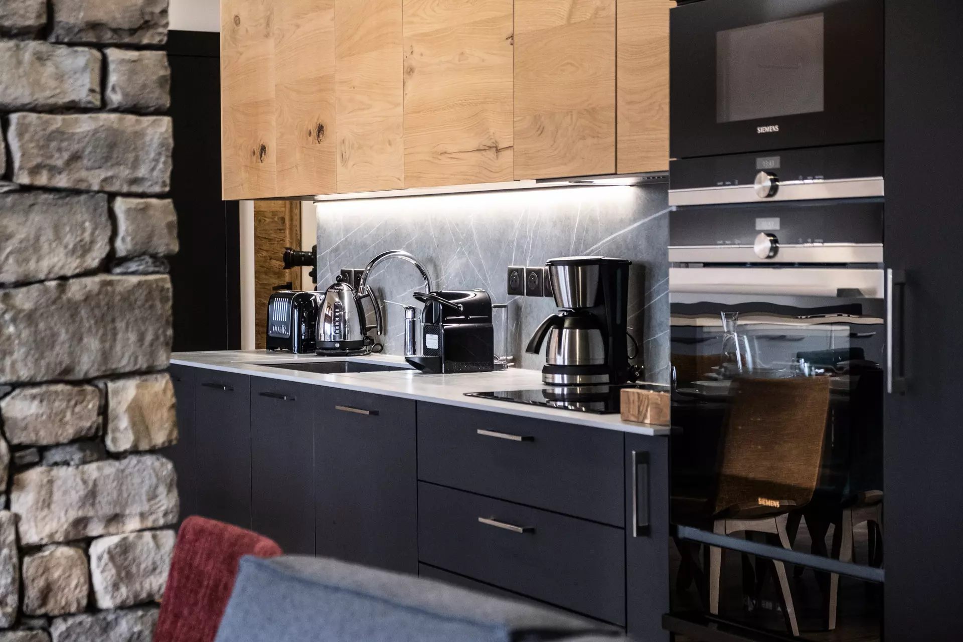 Cuisine toute équipée (cafetière Nespresso, cafetière à filtre et cave à vin)