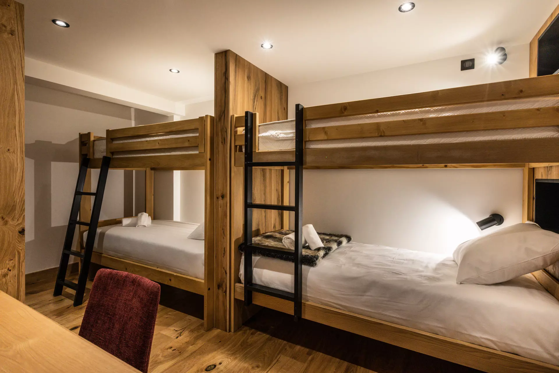 Chambre 1 : deux lits simples jumelables 90 x 200 avec salle de bain attenante avec WC, dortoir en continuité avec deux lits superposés et salle de bain attenante.
