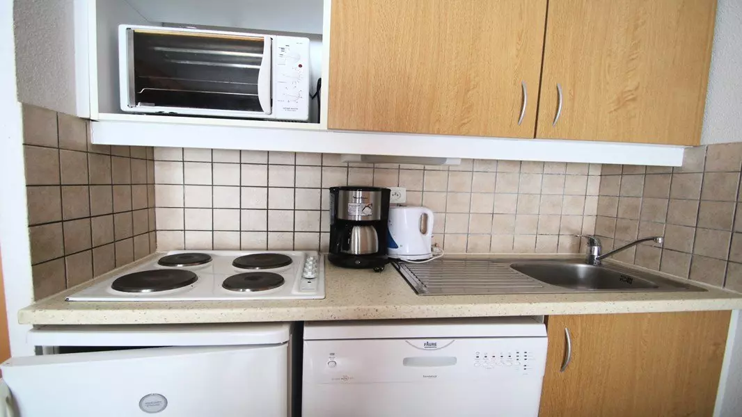 Cuisine équipée : lave vaisselle, 4 plaques électriques, mini four, bouilloire, cafetière, grille pain.