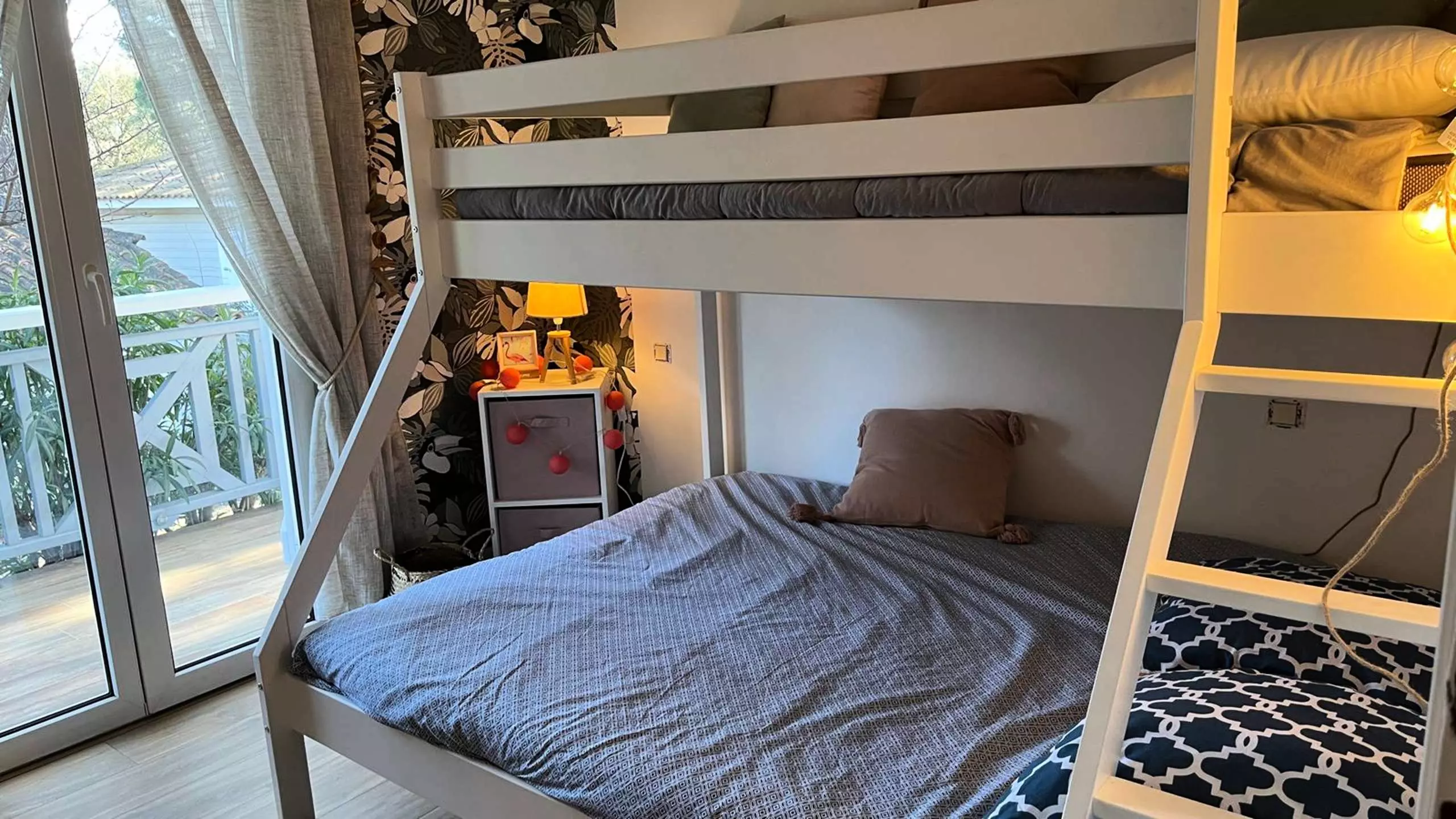 Ce chalet d'environ 50 m2 possède une belle cuisine équipée avec un cellier ouverte sur le séjour et un coin repas, une agréable terrasse de 15m², et 2 chambres dont une avec un lit double en 160, et une avec un lit simple superposé à un lit double en 140. Vous disposerez d'une salle d'eau avec WC.