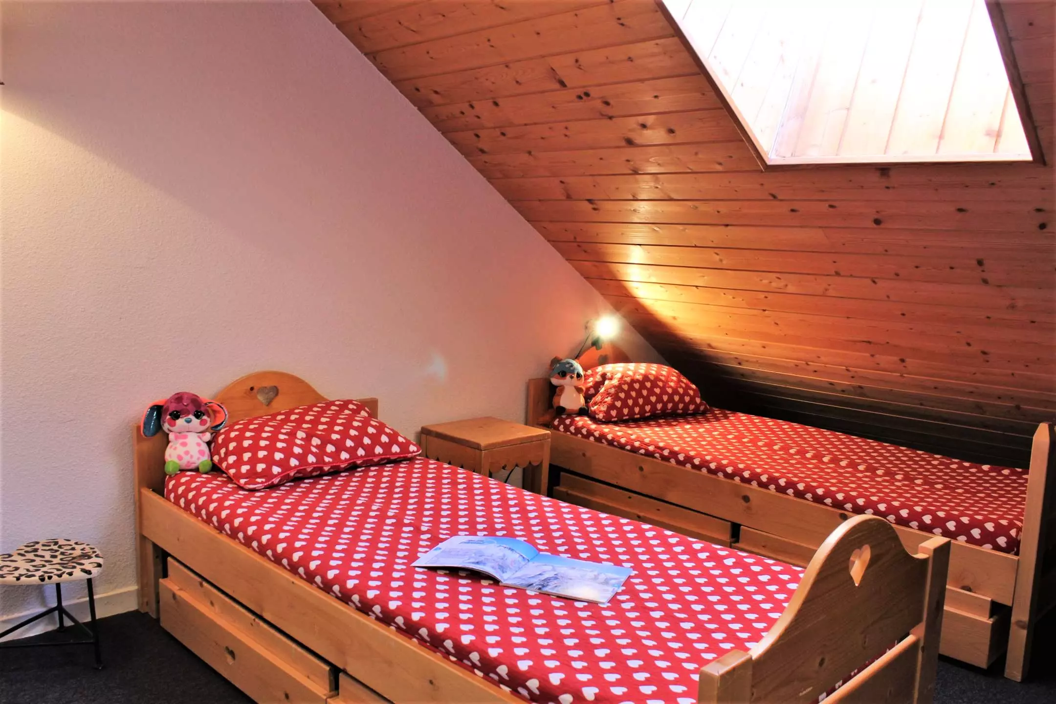 A l'étage se trouve : une première chambre avec deux lits jumeaux, une deuxième avec deux lits superposés, une salle d'eau avec douche et WC non séparés.