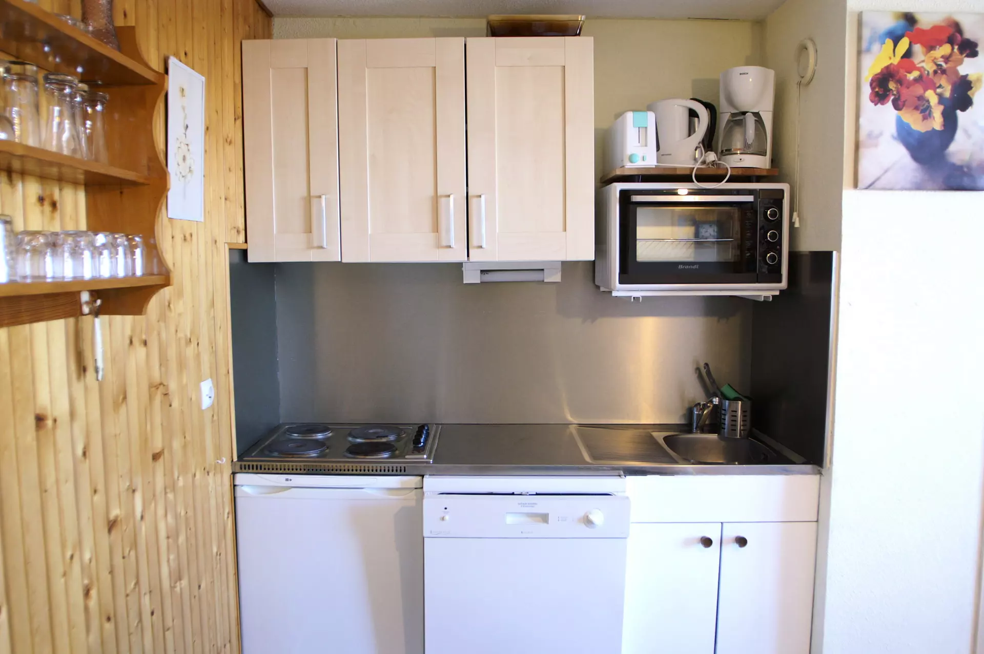 Coin cuisine comprenant 1 plaque de cuisson 3 feux, réfrigérateur avec freezer, lave-vaisselle, mini-four et four micro-onde.