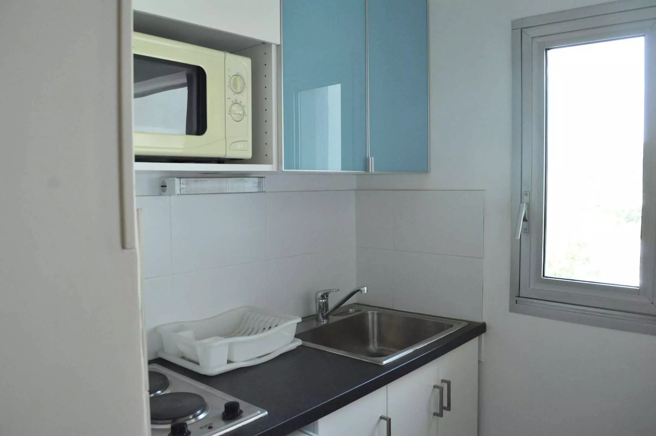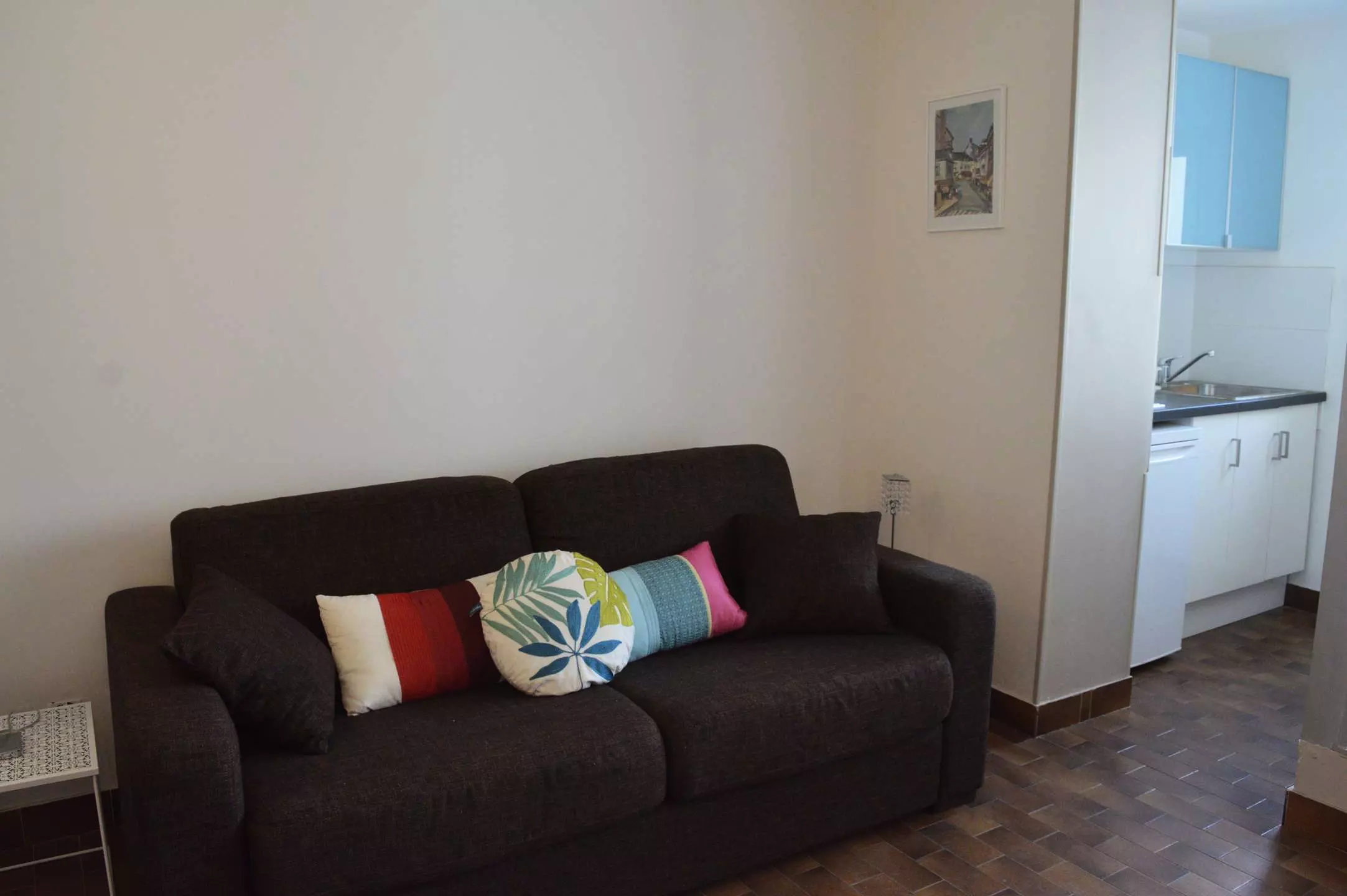 Cet appartement de vacances, situé au 2ème étage avec ascenseur comprend un séjour avec un canapé convertible 2 places et télévision, un coin cuisine équipé ainsi qu'une salle d'eau avec WC.