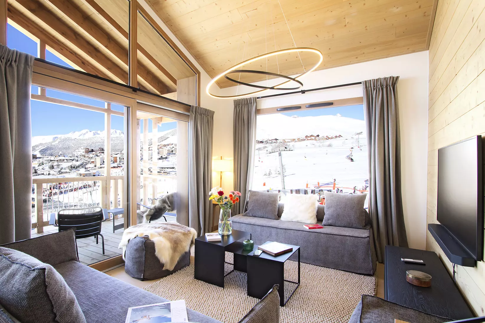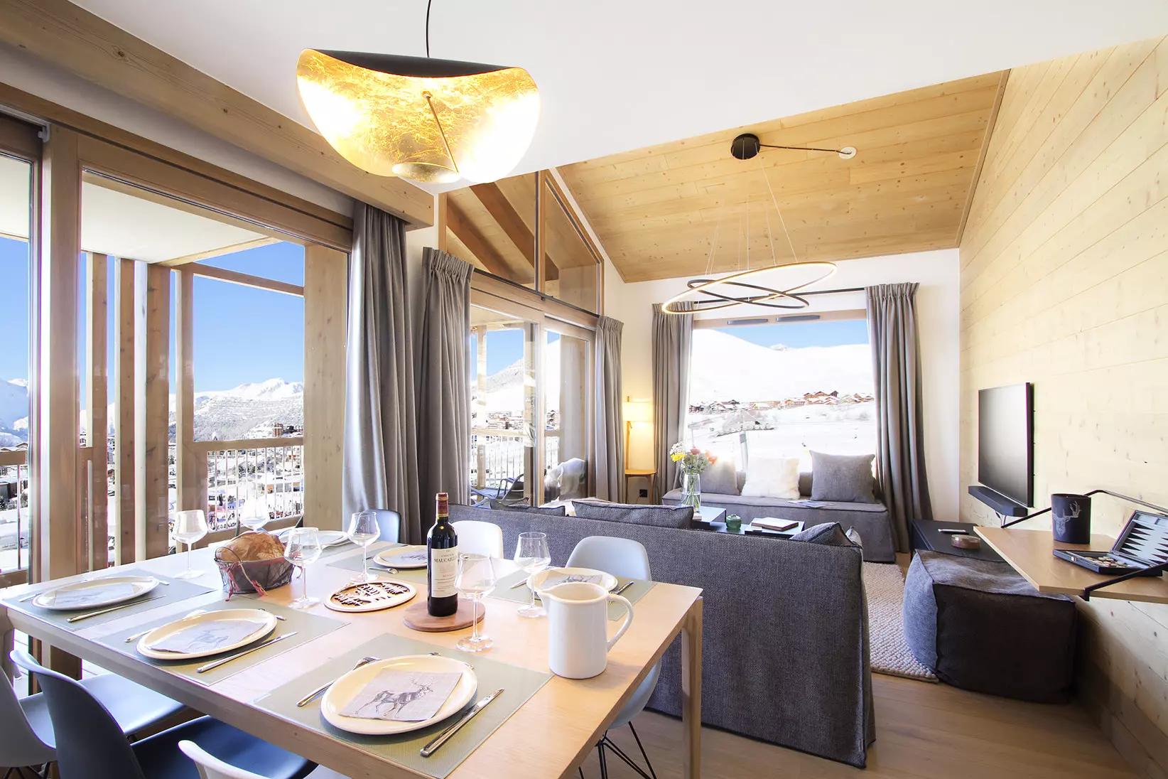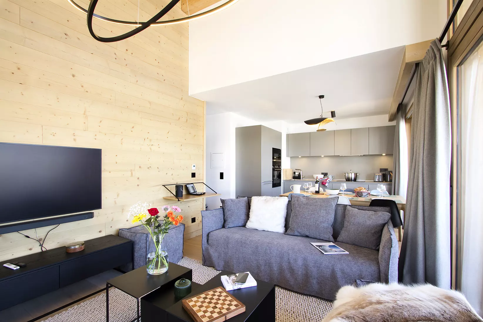 Au niveau de l'entrée de l'appartement se trouve un séjour en cathédrale avec un confortable canapé, cheminée bois donnant sur un balcon de 24m² exposé Sud-Ouest aménagé et équipé pour des moments de détente au soleil.