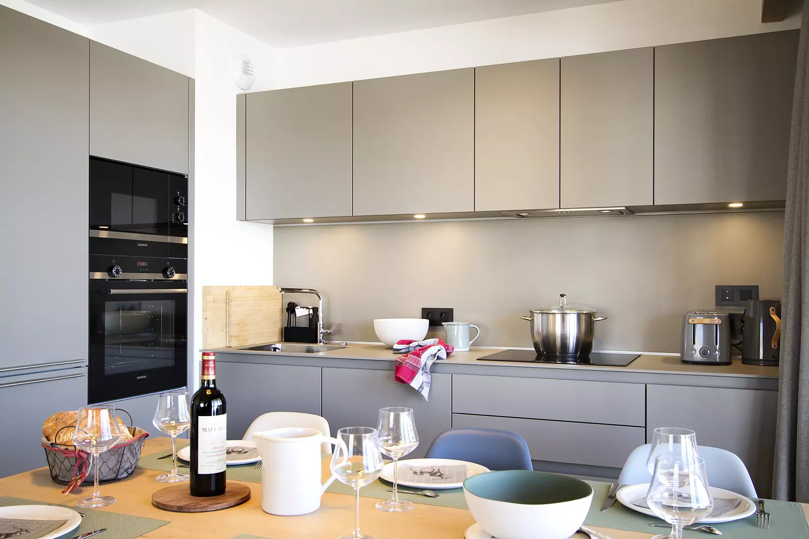 Une cuisine équipée de four combiné four micro-onde, lave-vaisselle, frigo, plaque à induction, machine à café toutes capsules, appareil à raclette, appareil à fondue, lave-linge.