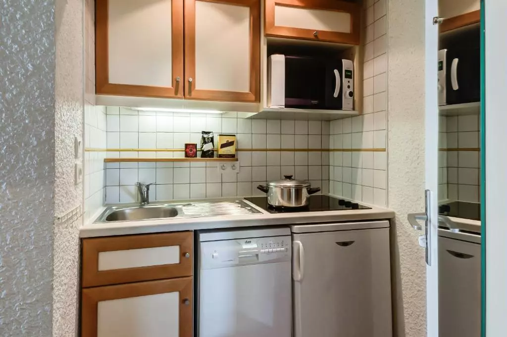 L'équipement comprend une plaque de cuisson vitrocéramique, un lave-vaisselle, un micro-ondes, un grille-pain, une cafetière et une bouilloire.
