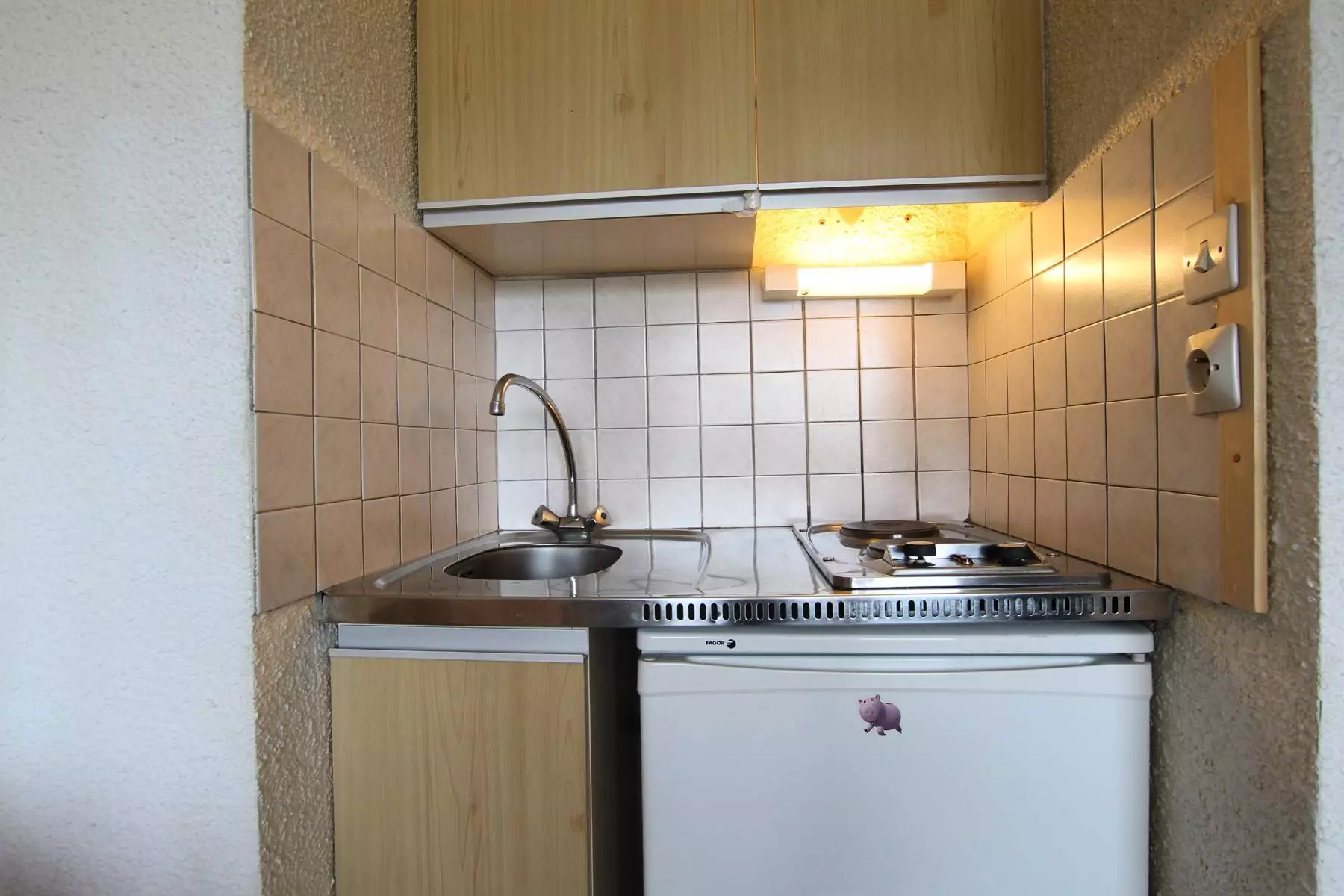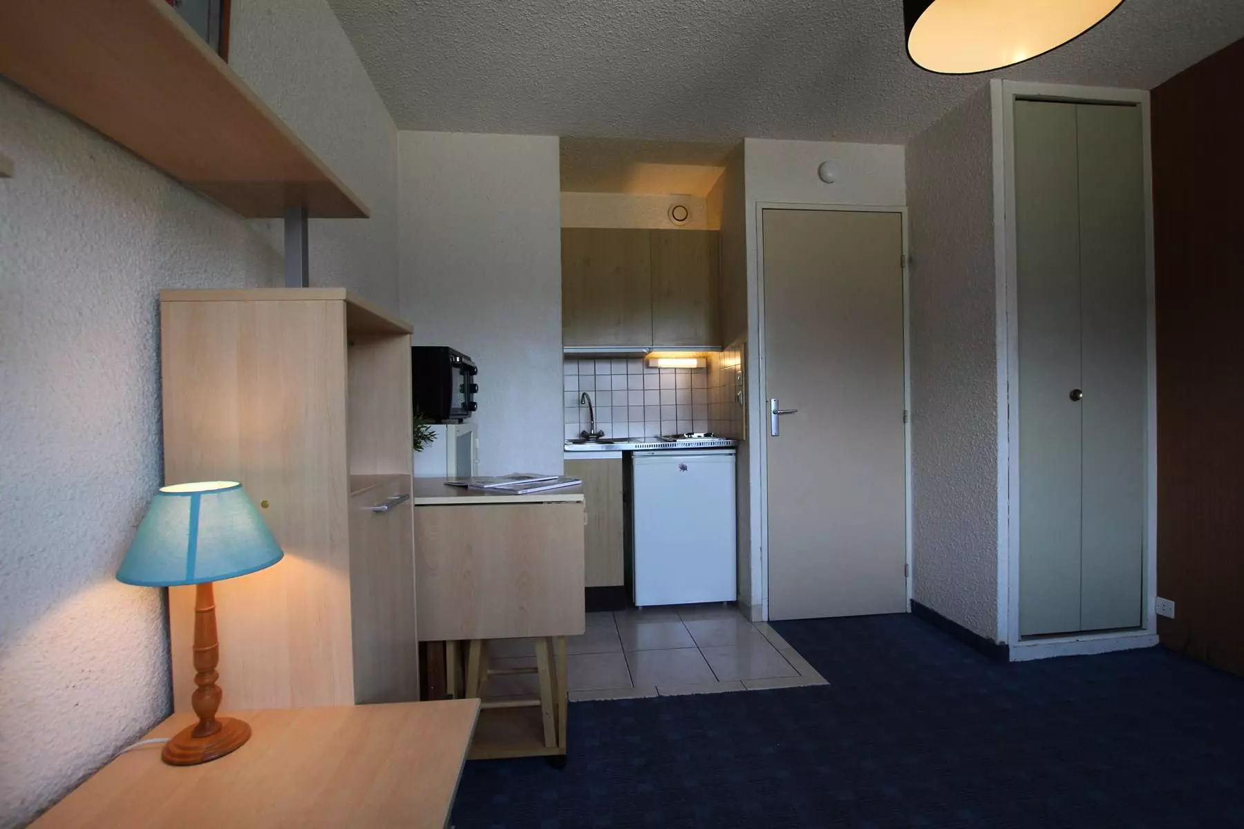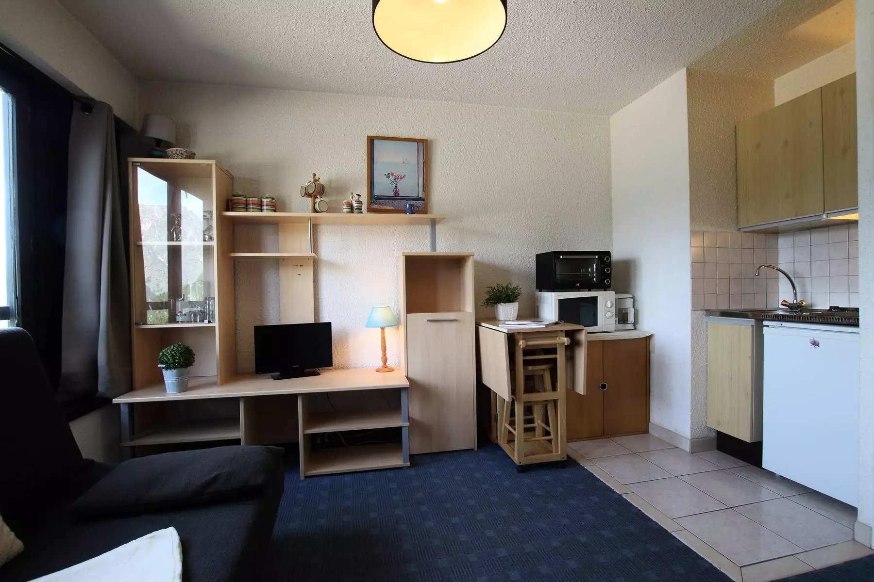 Ce petit studio de montagne de 17 m² avec 4 couchages, se situe au 2eme étage avec ascenseur de la résidence Podium, à Puy Saint Vincent 1600, aux pieds des pistes.