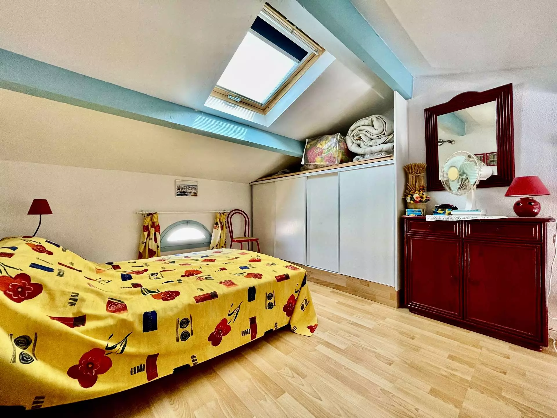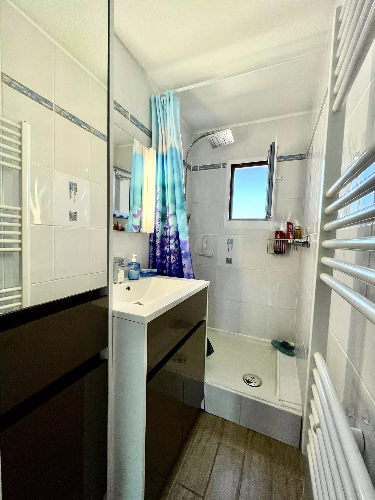 Cet appartement à la mer, au 2ème étage, dispose d'un séjour avec un coin cuisine équipée et un espace salon avec télévision, une chambre avec un lit double, une grande mezzanine haute avec un lit double et un canapé convertible, une salle d'eau avec douche, les wc sont séparés. Le séjour donne sur un petit balcon avec vue sur les marinas.