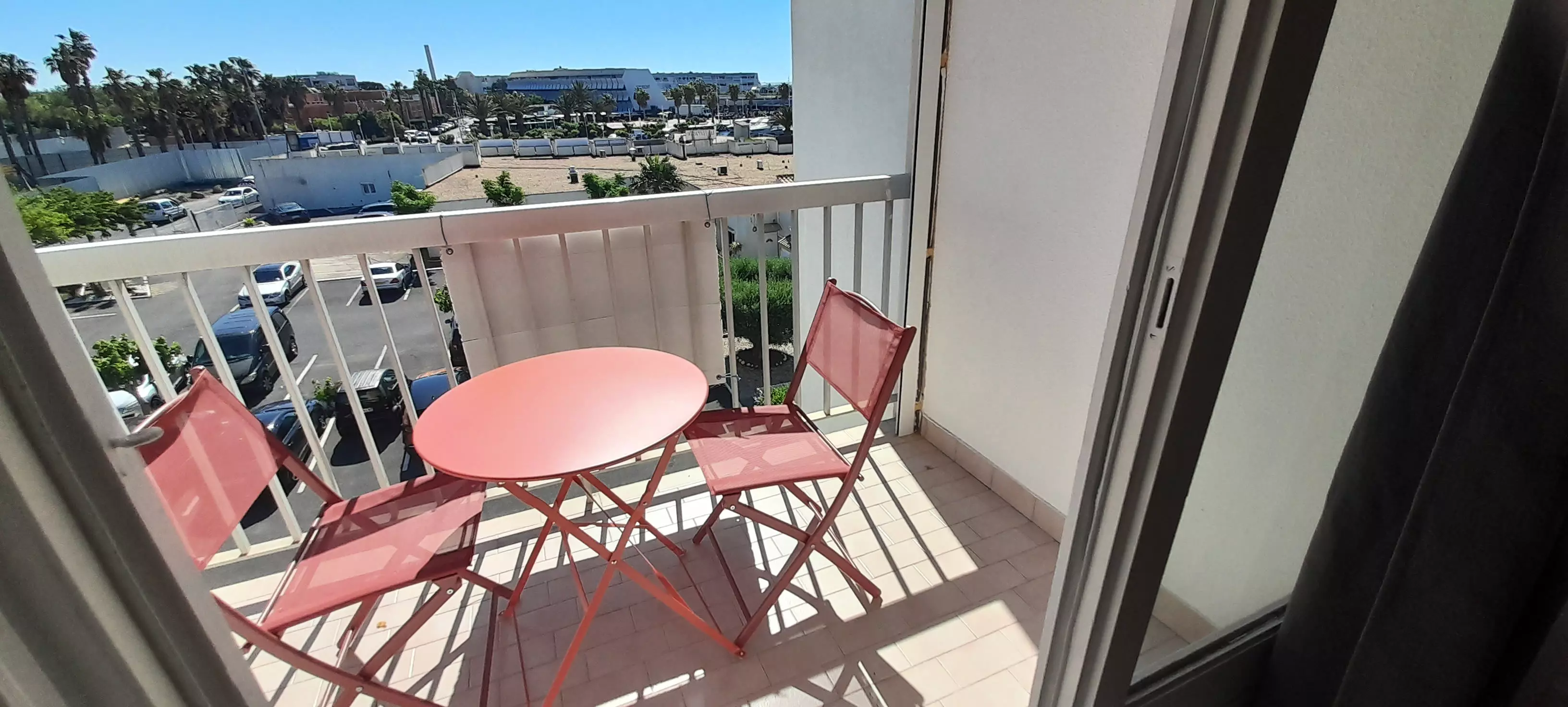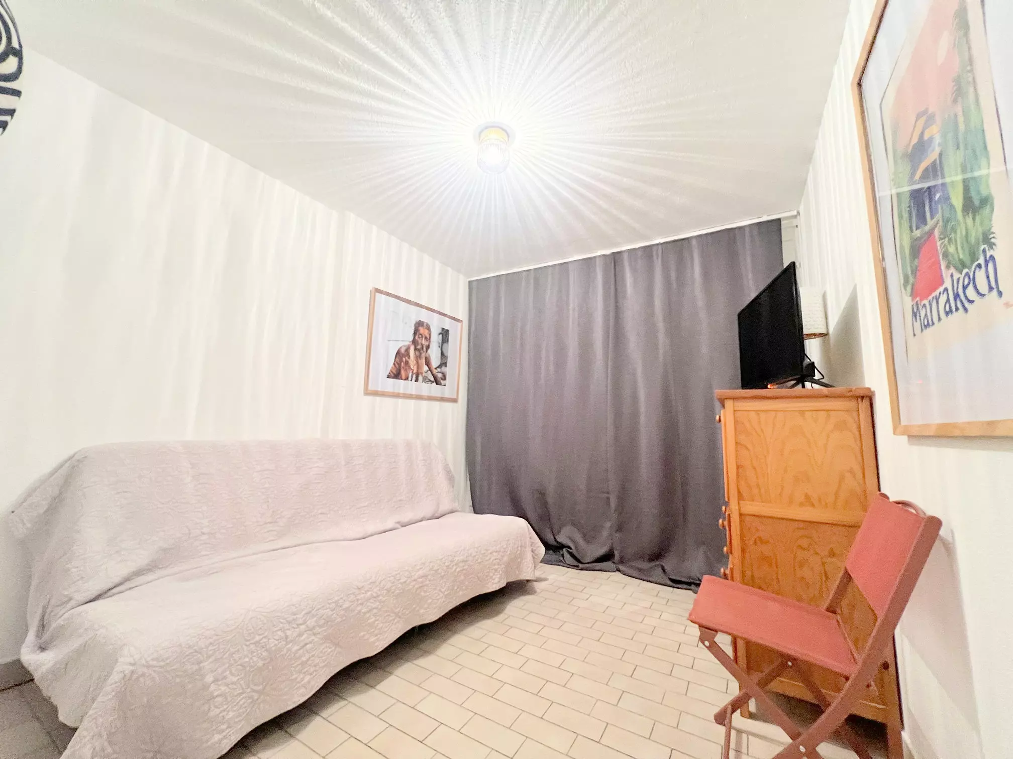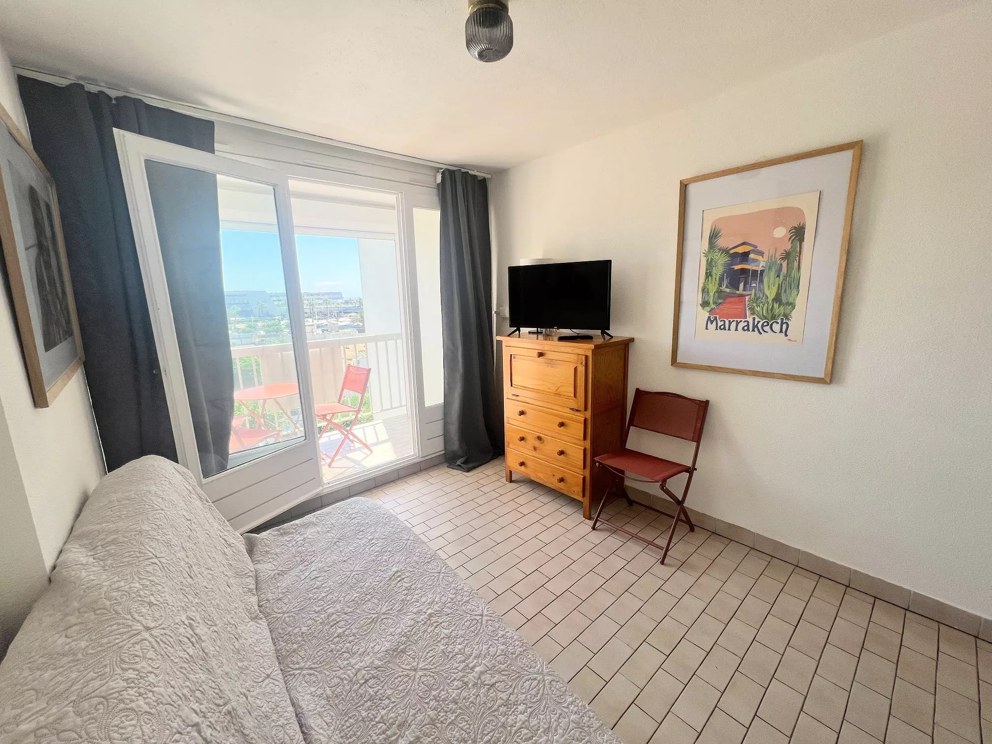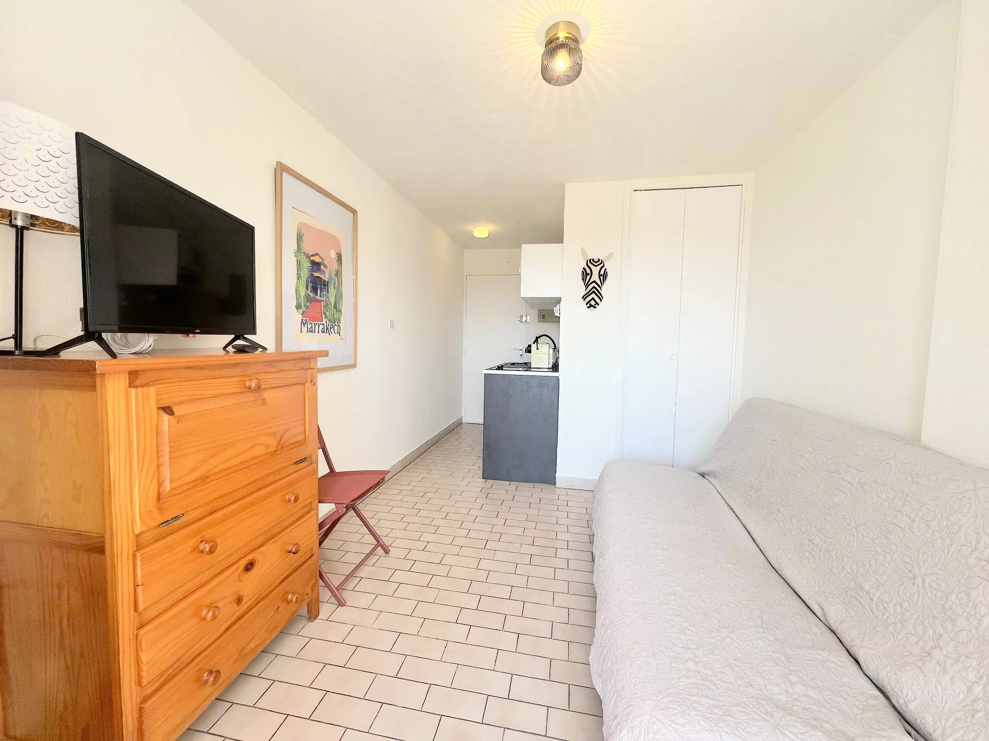 Studio pour 2 personnes, situé Résidence Port Soleil B3, avec piscine. Au 3ème étage avec ascenseur. Séjour avec un clic clac en 140 cm. Coin cuisine équipée. Télévision, micro ondes et cafetière Nespresso. Salle d'eau avec wc. Terrasse exposée à l'est. Le parking sécurisé de la résidence est à votre disposition sous réserve de disponibilité.