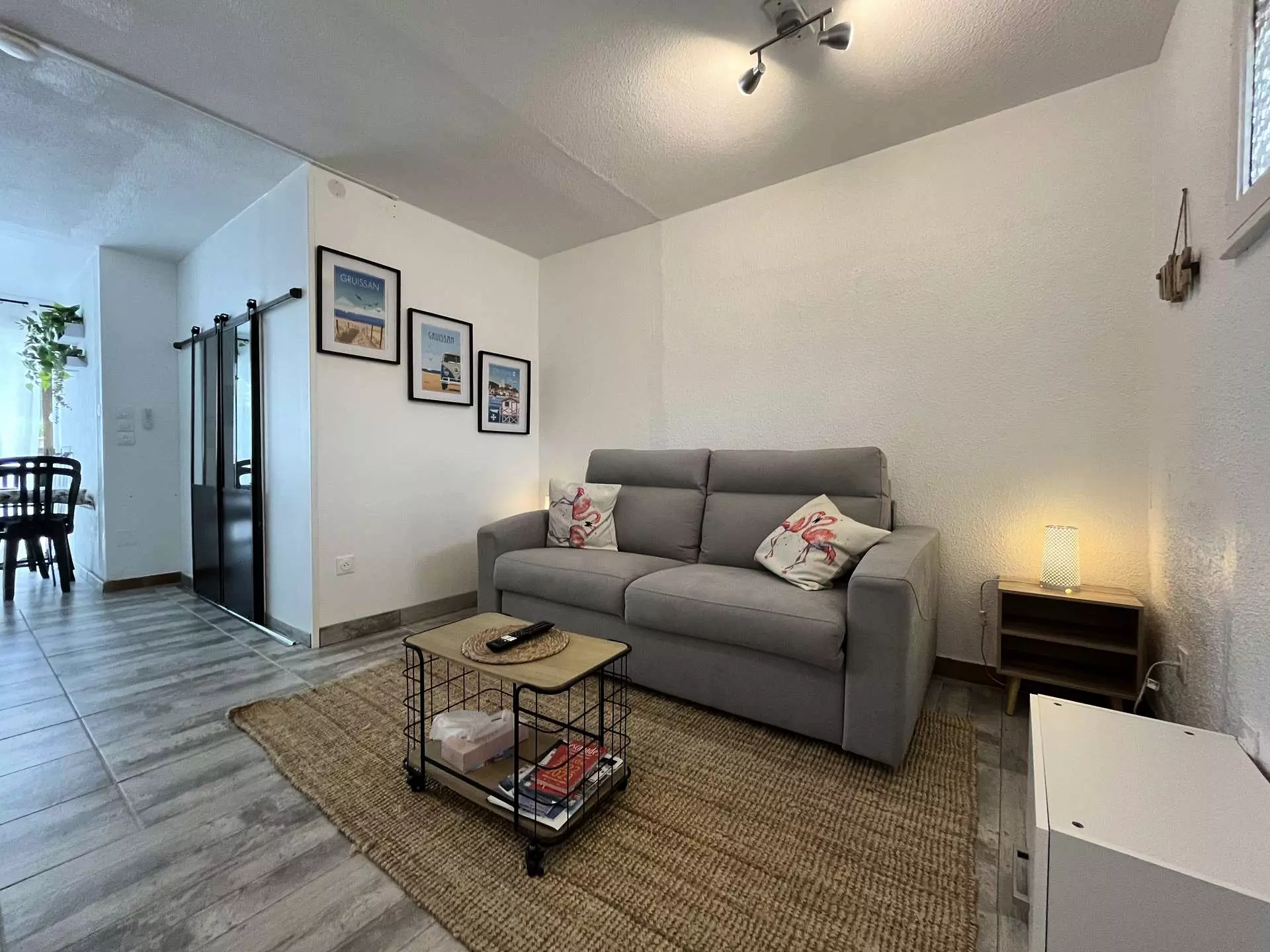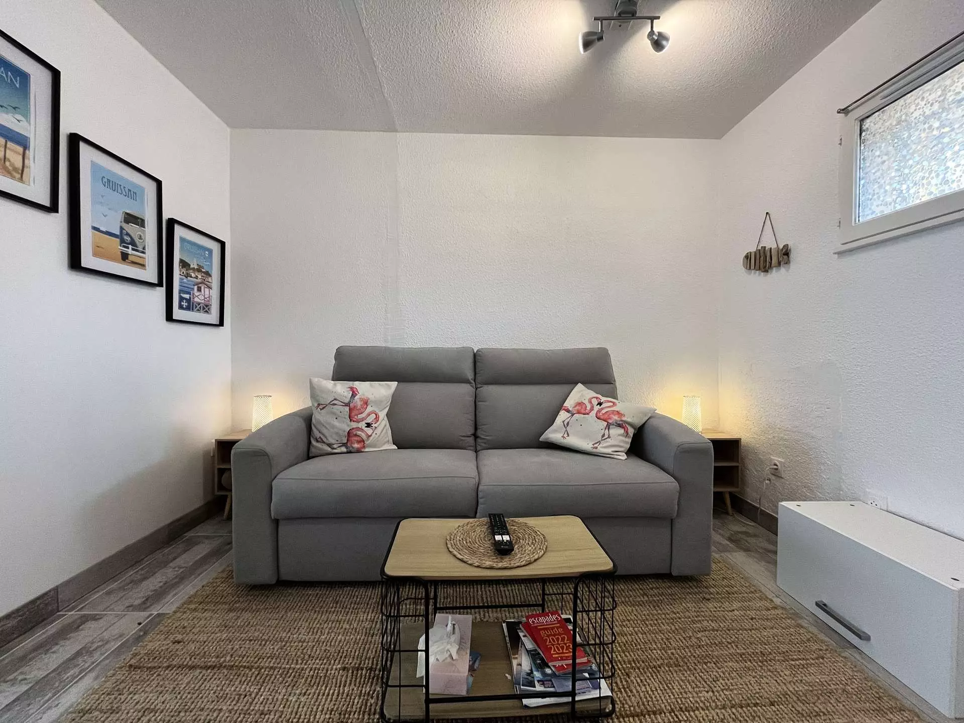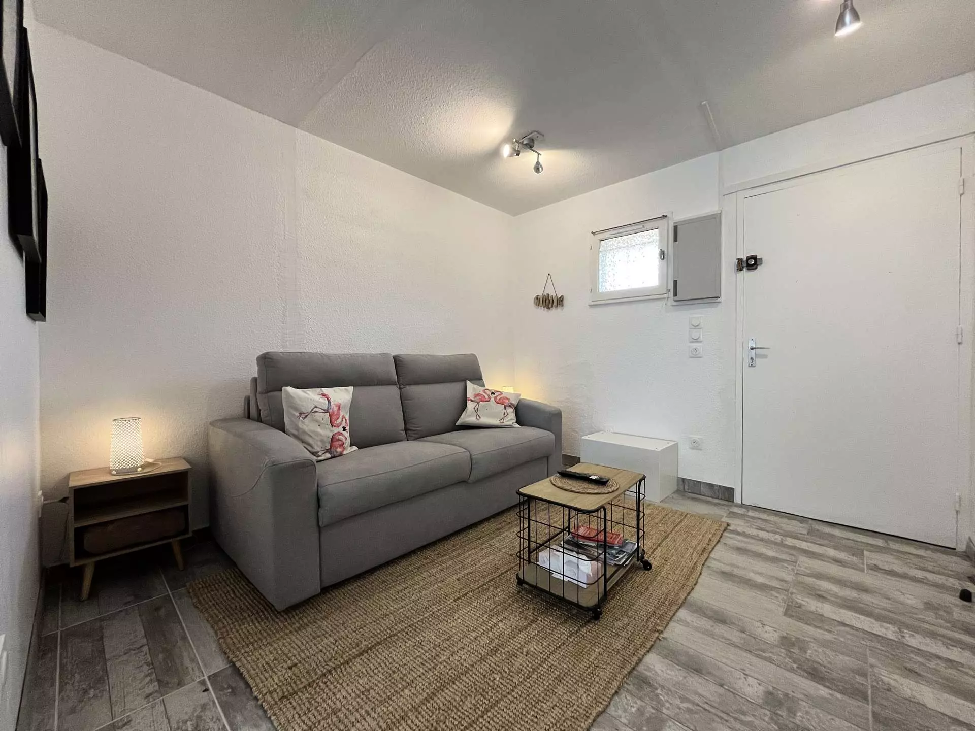 Cet appartement en location vacances situé en rez-de-chaussée et refait à neuf se décline en un séjour avec un canapé-lit rapido (couchage 140), un coin cuisine équipé, une cabine fermée avec lits superposés (2x90) et une salle d'eau avec wc et lave-linge.