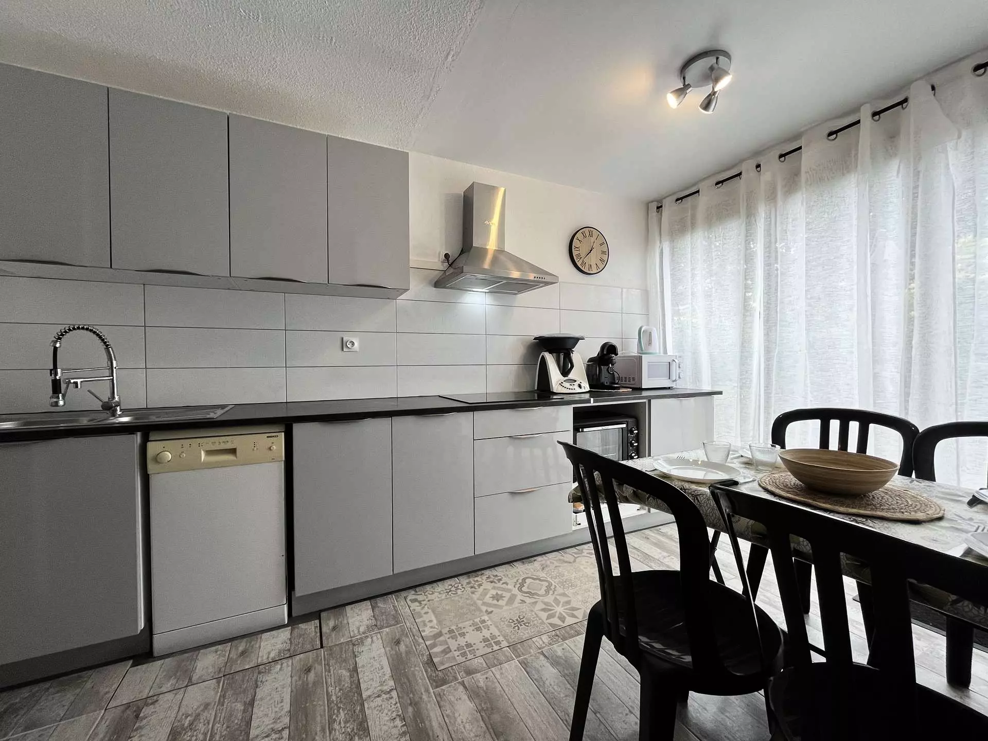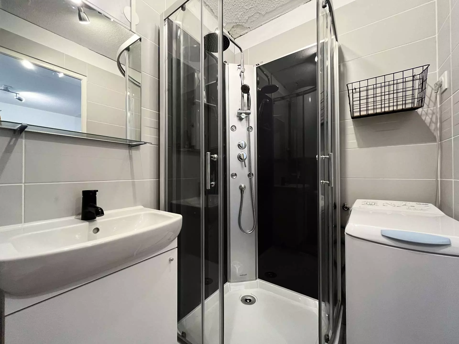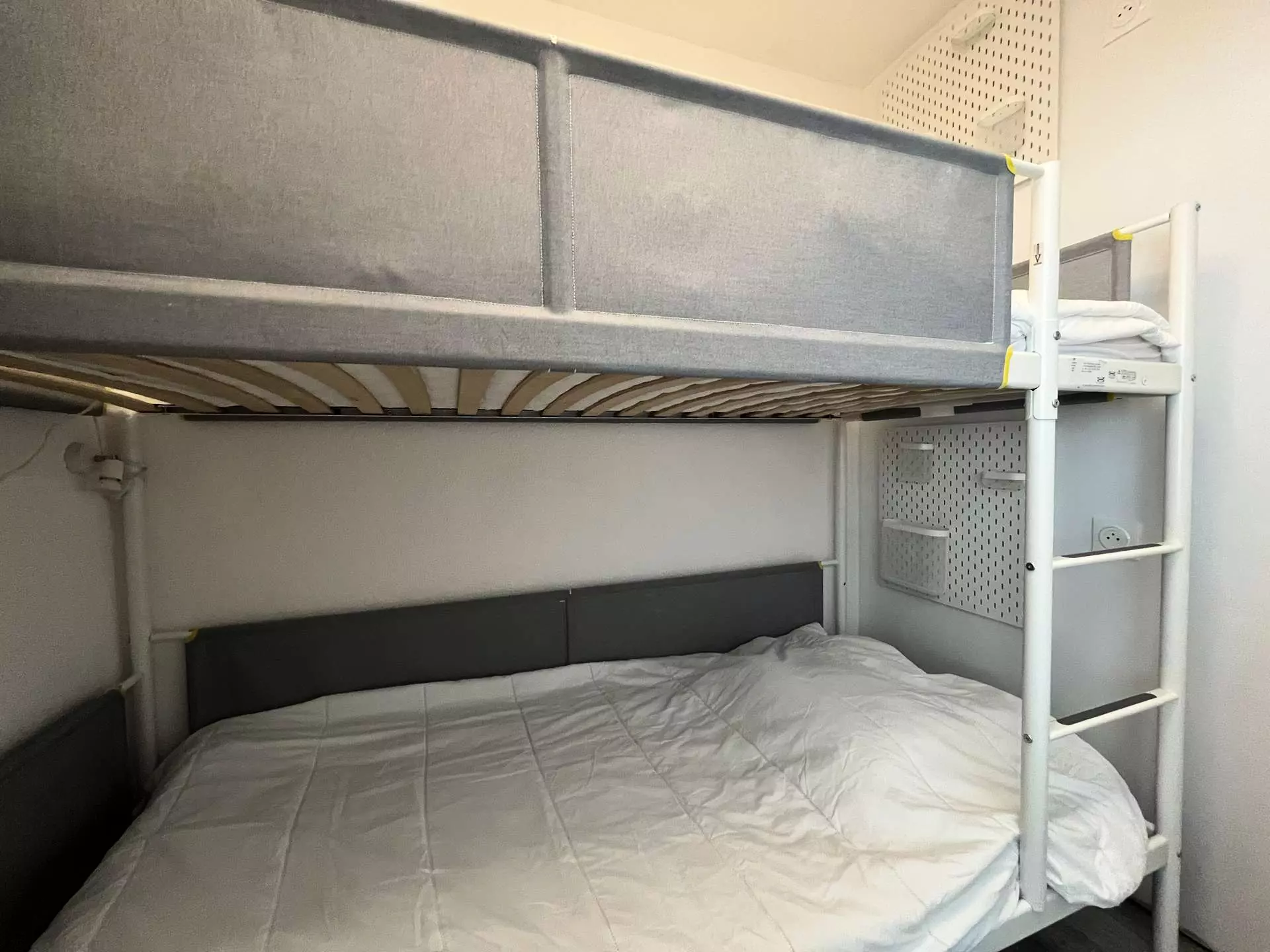 Cet appartement en location vacances situé en rez-de-chaussée et refait à neuf se décline en un séjour avec un canapé-lit rapido (couchage 140), un coin cuisine équipé, une cabine fermée avec lits superposés (2x90) et une salle d'eau avec wc et lave-linge.
