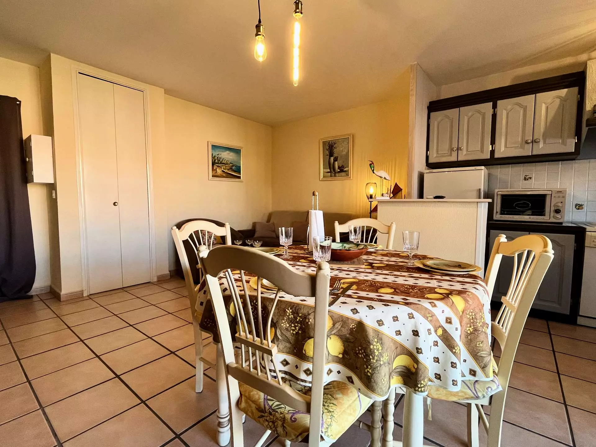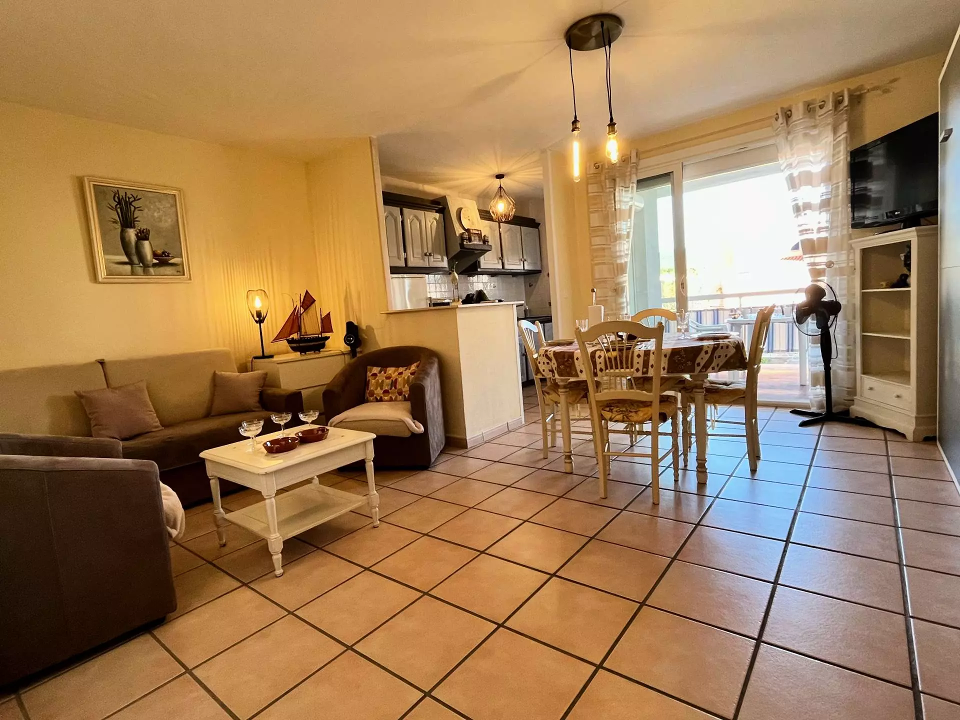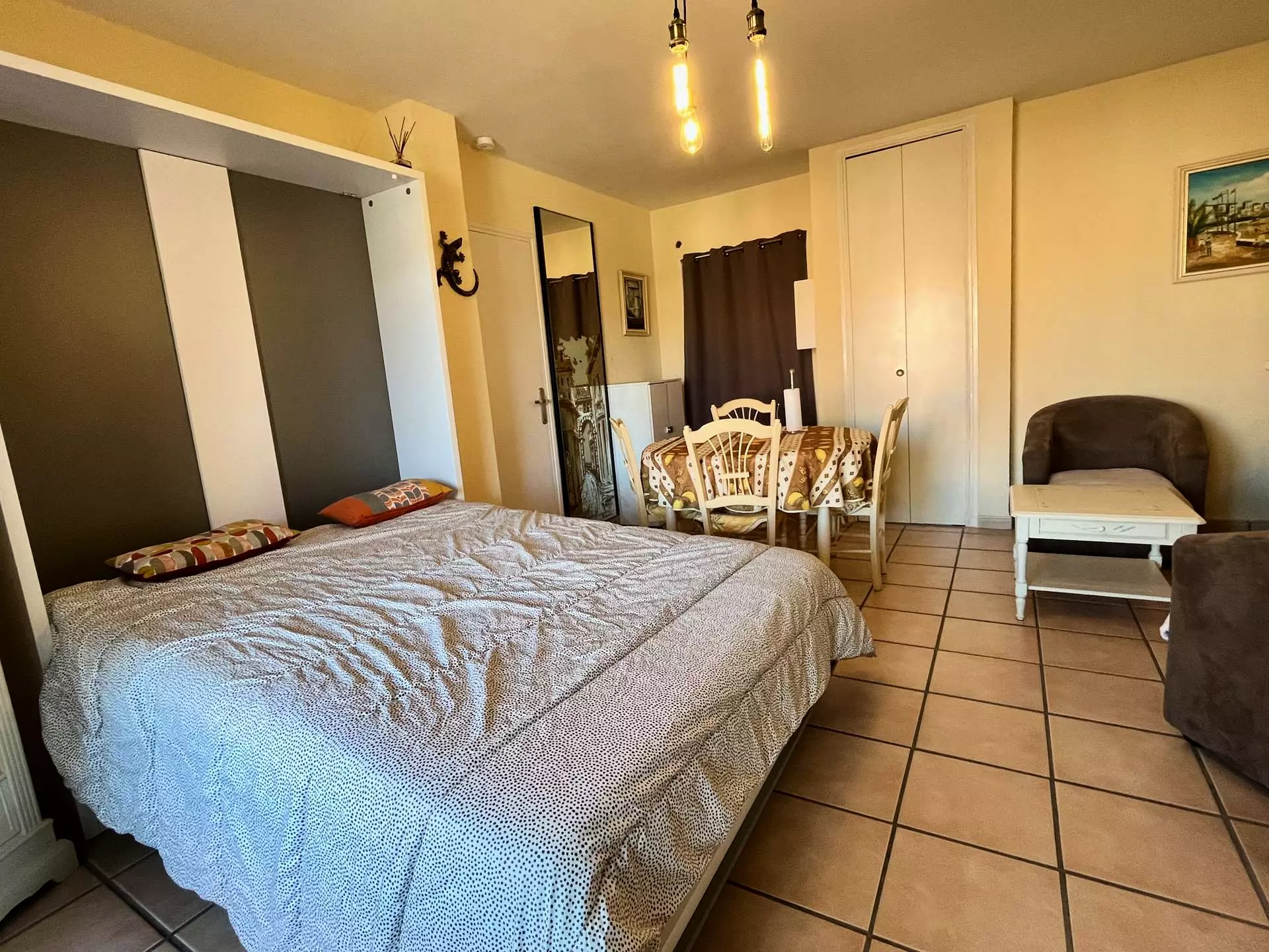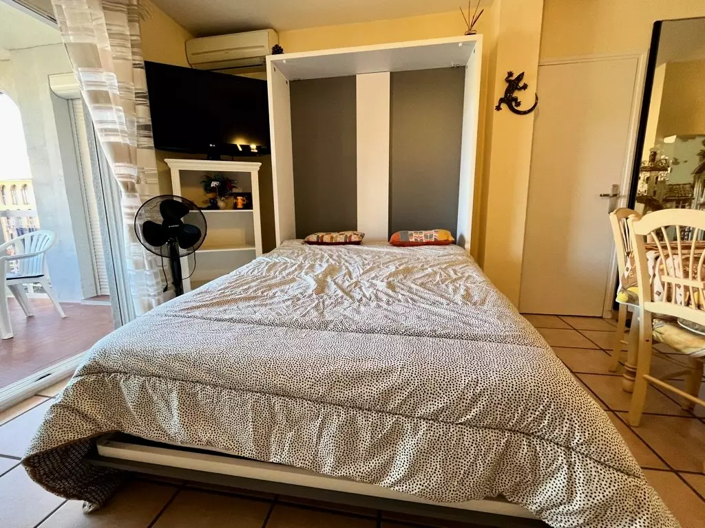 Ce logement à la mer est composé d'une chambre avec un lits 2 personnes 160X200, une salle de douche, un WC séparé, d'un séjour/salle a manger, cuisine ouverte équipée avec un lit escamotable 2 personnes 160x200, Terrasse, place de parking privée.