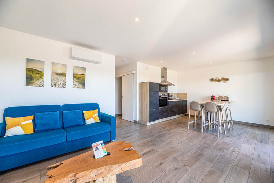 Les "Appartements pour 6 personnes" offrent quant à eux deux chambres (une première avec 1 lit double (180x200) et une deuxième avec 2 lits simples (90x200)), deux salles de douche et un WC séparé. Le salon dispose également d'un confortable canapé-lit (160x195), idéal pour accueillir deux personnes supplémentaires.