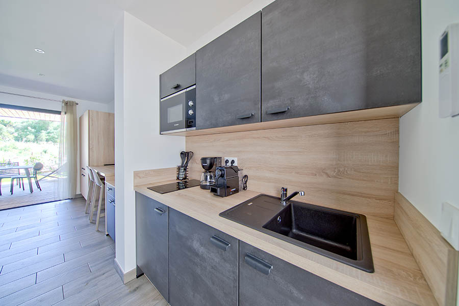 Les "Studios", pour 2 personnes disposent d'un espace nuit fermé avec un lit double (180x200), d'une salle de douche avec WC et d'une terrasse privée de 18 m², idéale pour profiter du soleil corse en toute intimité.