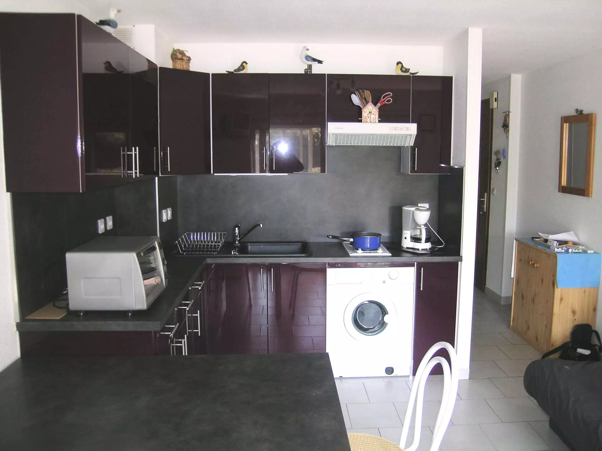 Coin cuisine tout équipé : réfrigérateur/congélateur, plaques de cuisson vitrocéramique, hotte aspirante, micro ondes, mini-four, cafetière électrique, lave-linge,...