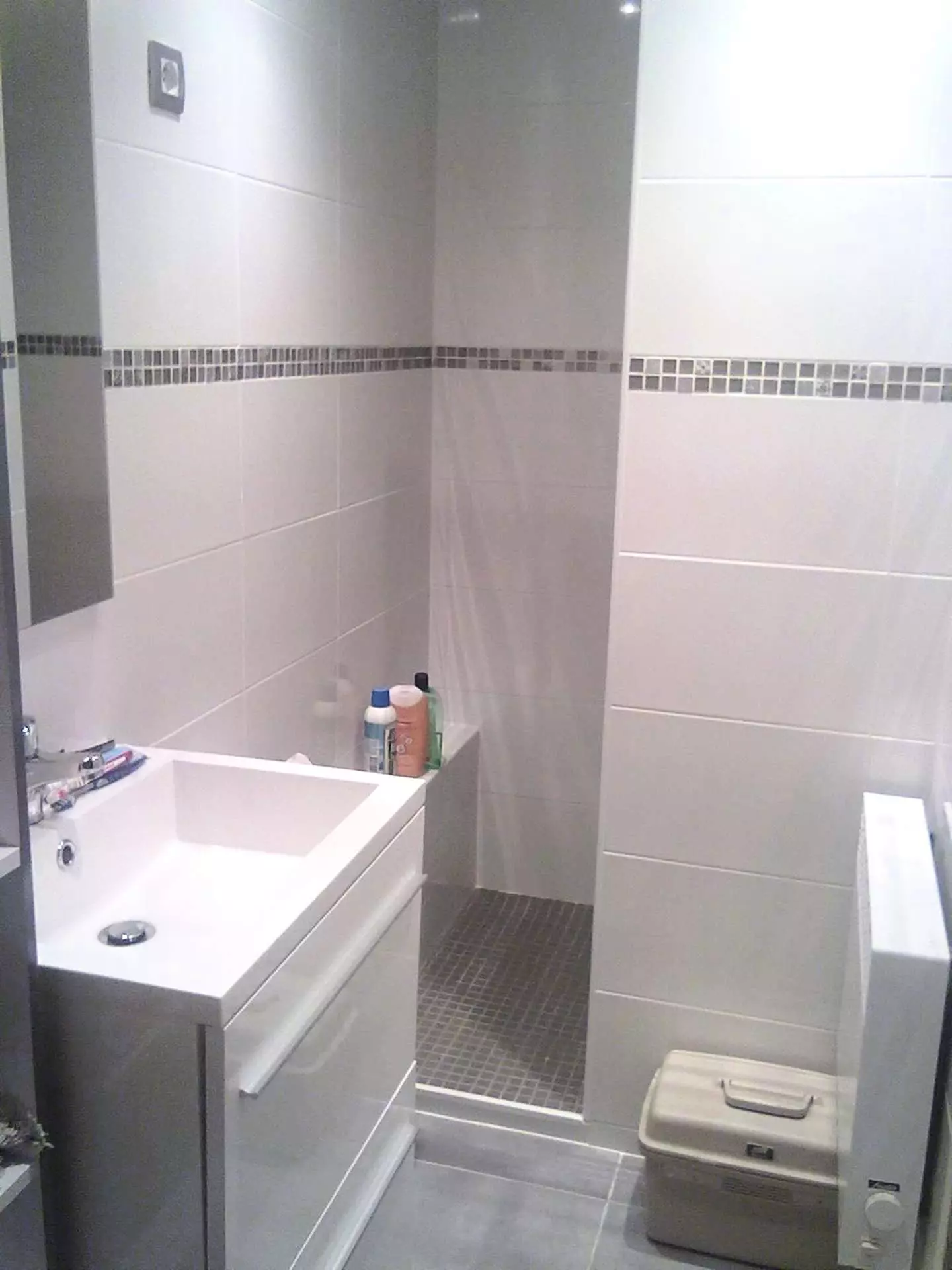 Salle d'eau refaite à neuf avec douche et lavabo. Les WC sont séparés.