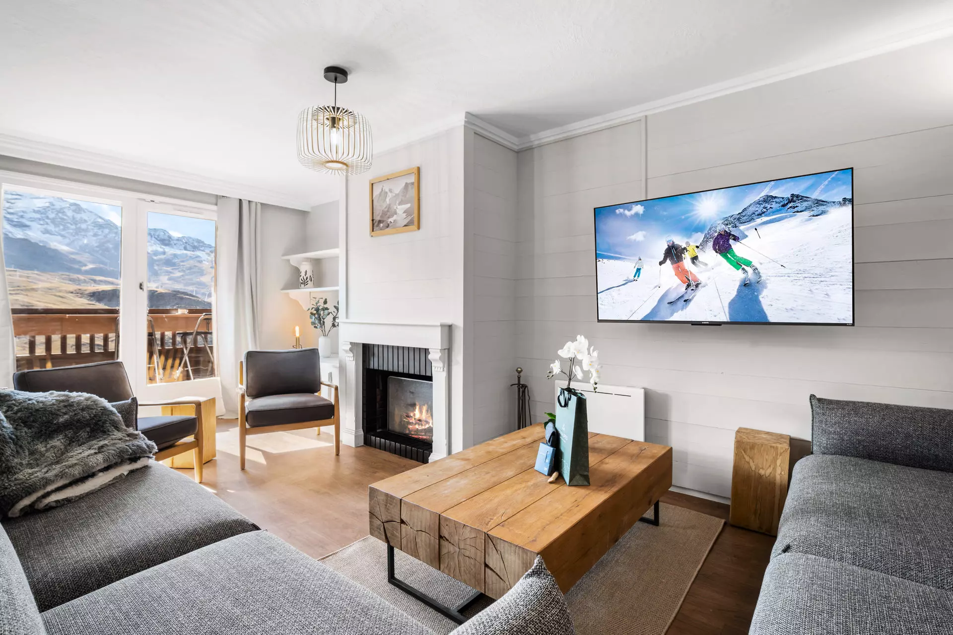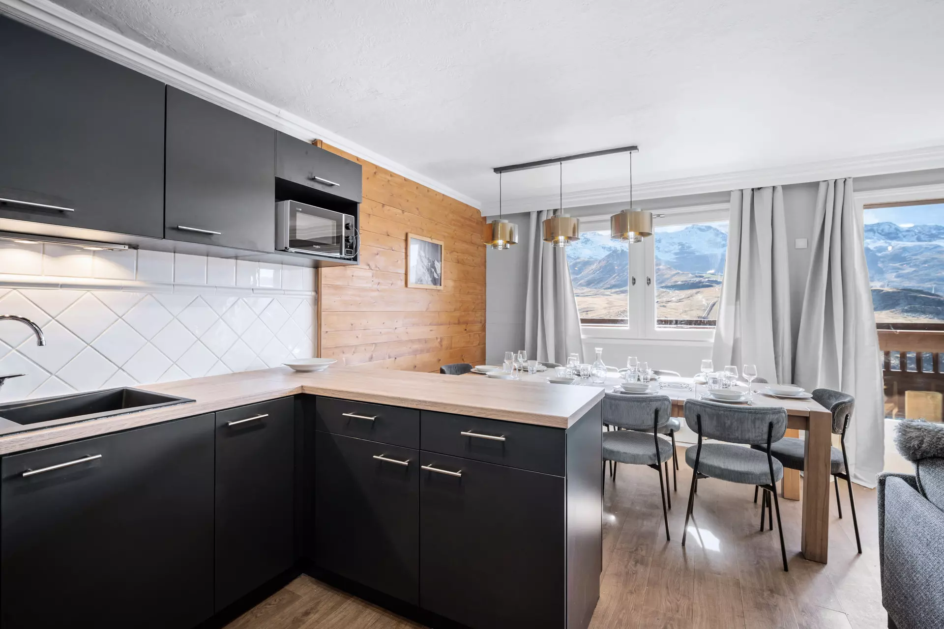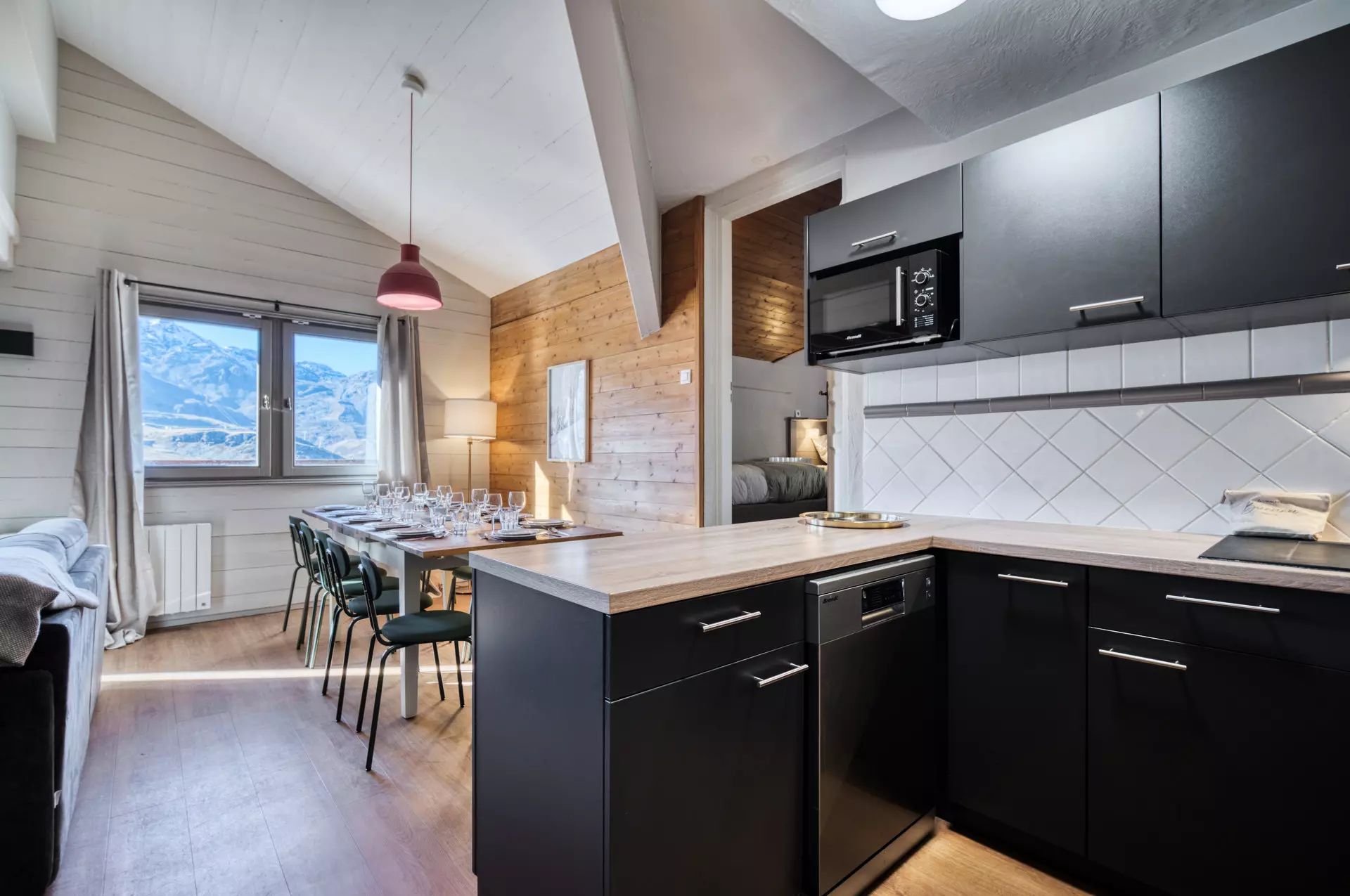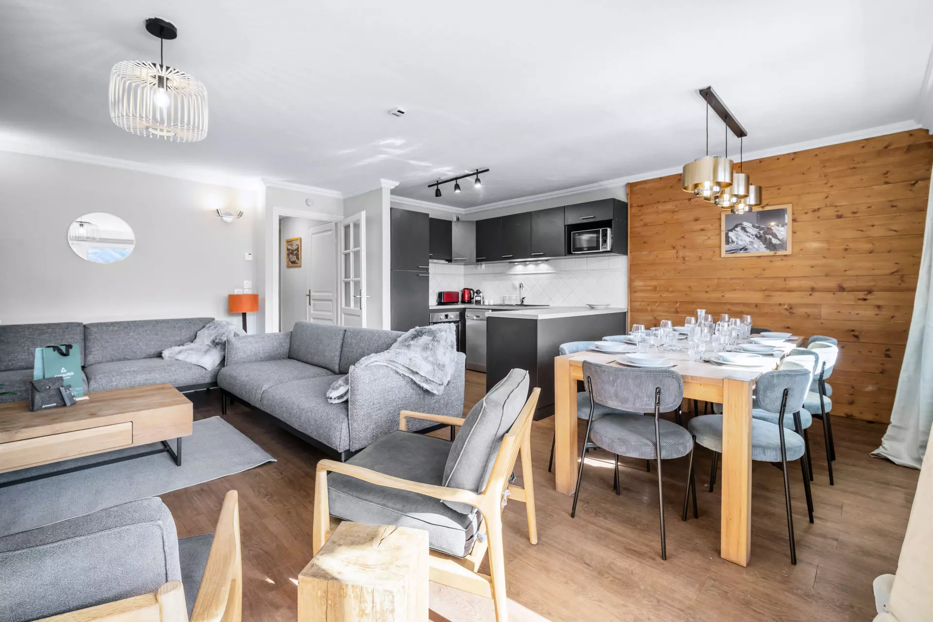 Doté d'une vue panoramique, le séjour lumineux est aménagé pour vous offrir un espace chaleureux et accueillant, avec un salon cosy idéal pour se détendre après une journée sur les pistes, ainsi qu'une cuisine ouverte entièrement équipée, alliant modernité et fonctionnalité. L'espace repas vous permettra de partager des moments mémorables en toute convivialité.