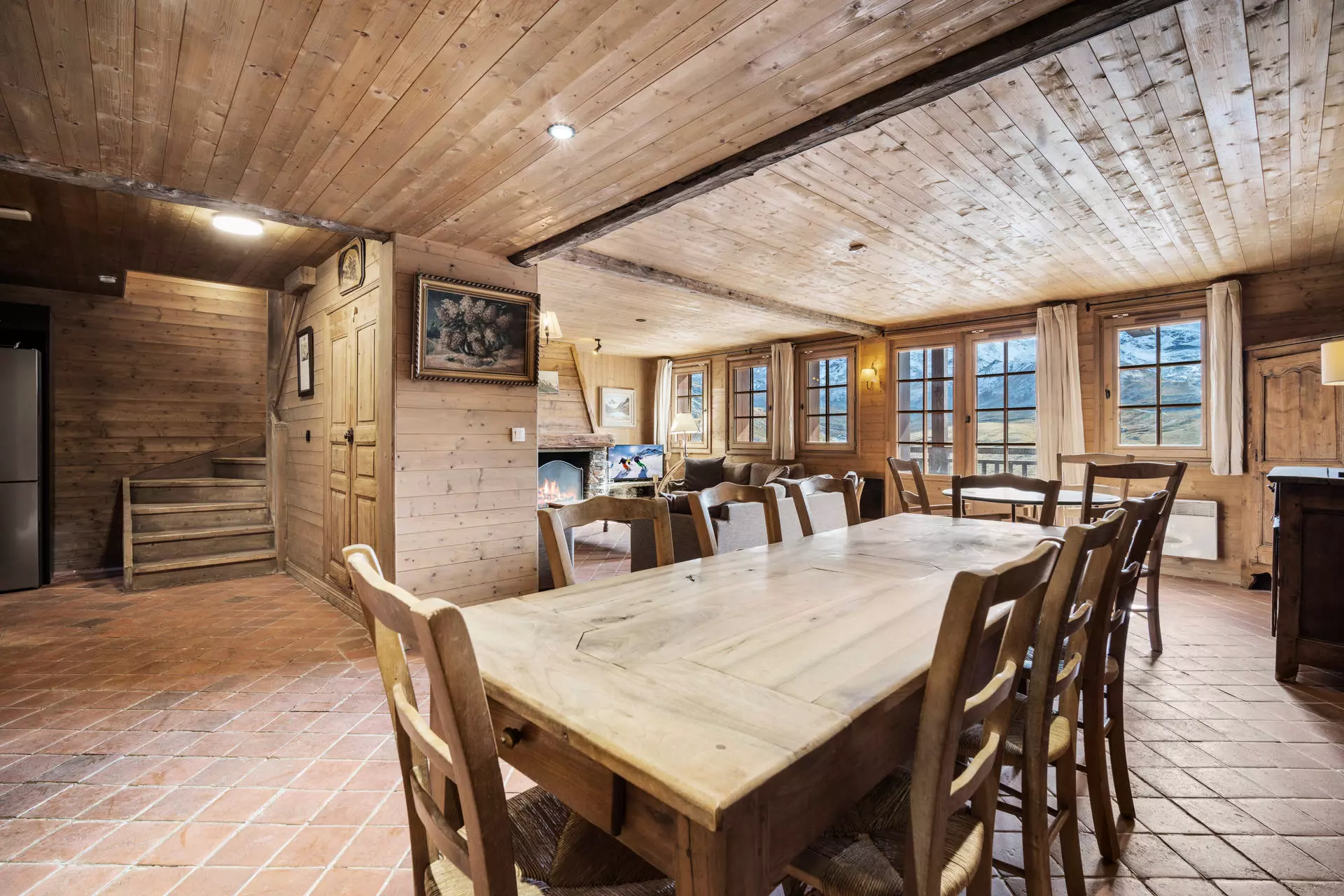 • Séjour avec salle à manger, cuisine équipée, espace salon avec cheminée, TV et acces balcon