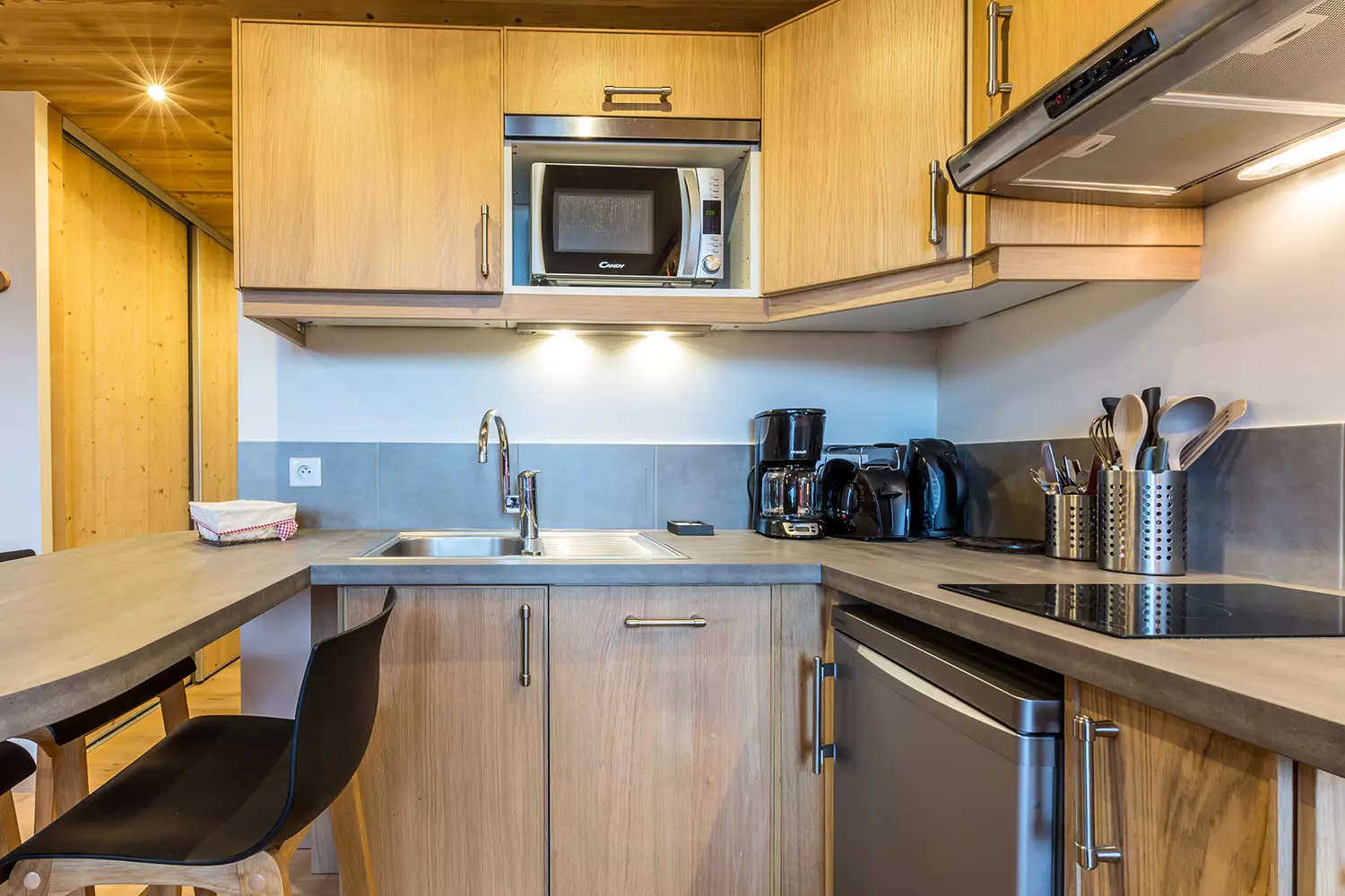 Kitchenette équipée de plaques vitrocéramiques, four, lave vaisselle, réfrigérateur, cafetière, grille-pain et bouilloire.