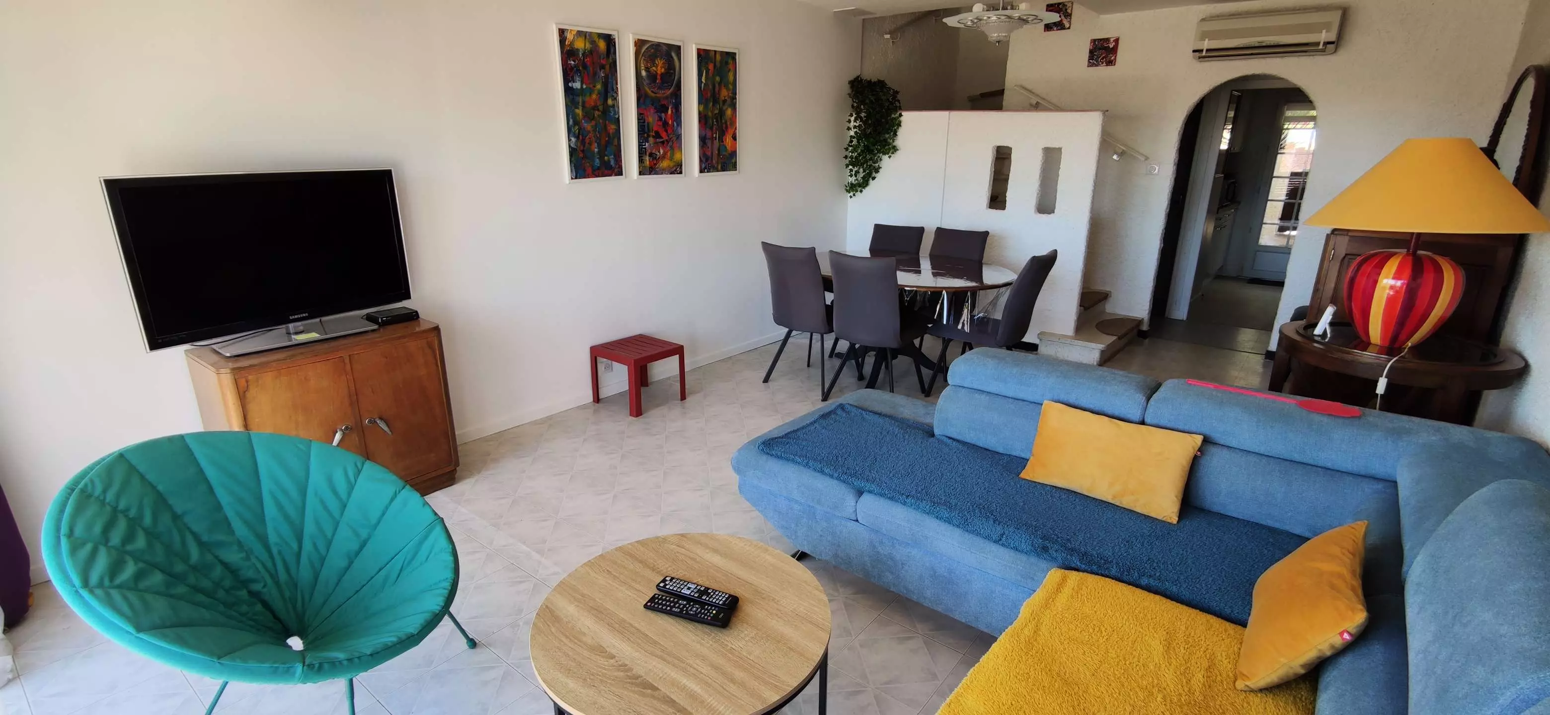 Cette maison comprend une cuisine aménagée et équipée, un séjour avec télévision (sous réserve d'une bonne réception) et grand canapé non convertible, une chambre avec un canapé convertible en 130cm, des wc indépendants. A l'étage se trouvent 2 belles chambres avec chacune un lit double (Un en 160cm et un en 140cm)et une salle d'eau avec wc et climatisation,60 m2 environ.