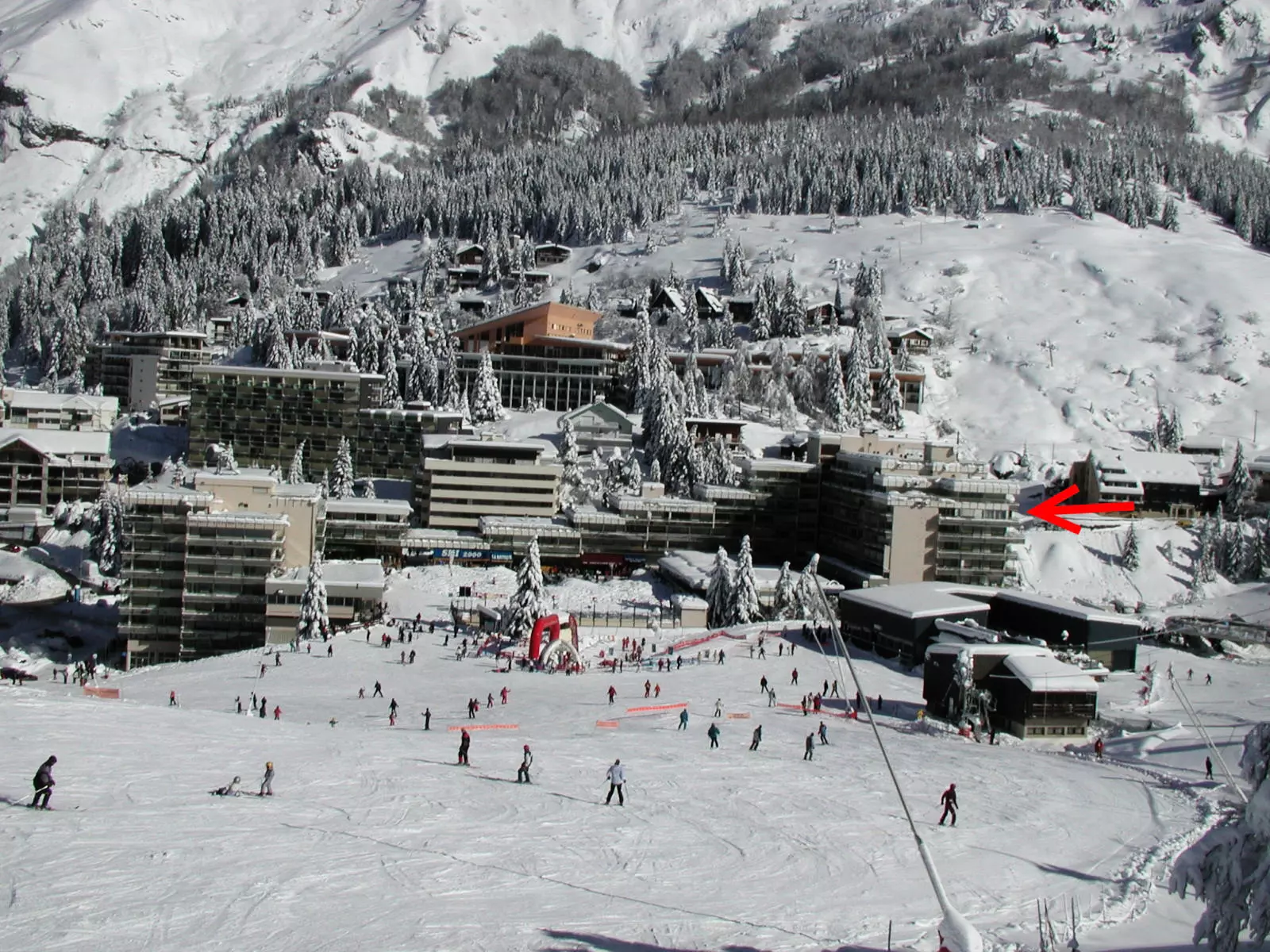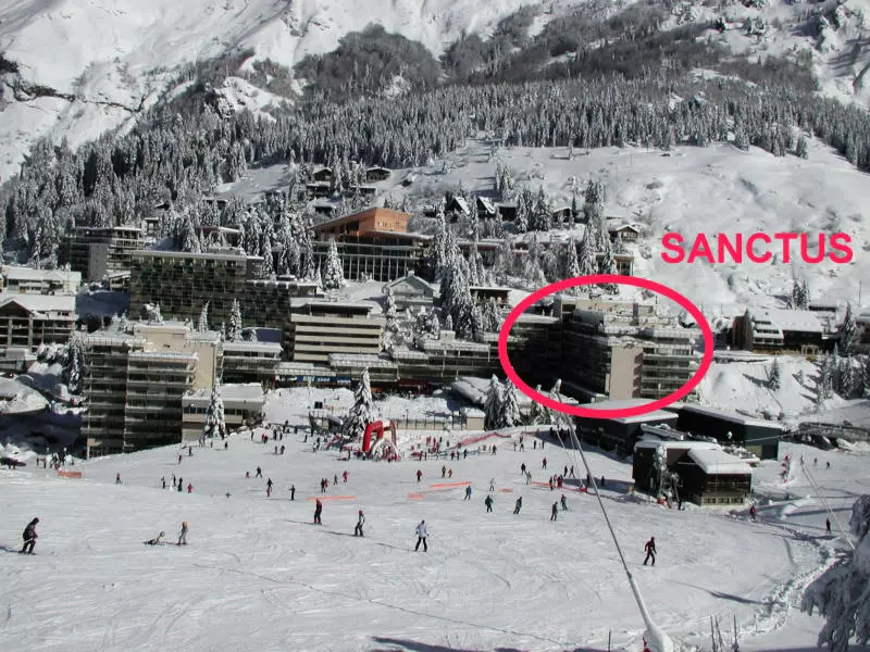 Résidence Sanctus n°23 sur le plan de la station, accessible à pied par un cheminement délimité sur 100 m. Les pistes de ski sont situées à 250 mètres (en raison de travaux) et les commerces à 150 mètres.