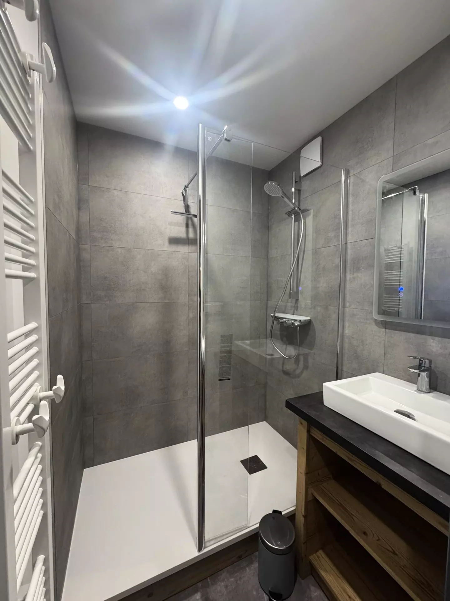 La cuisine est moderne et parfaitement équipée, et la salle de douche pratique et lumineuse.